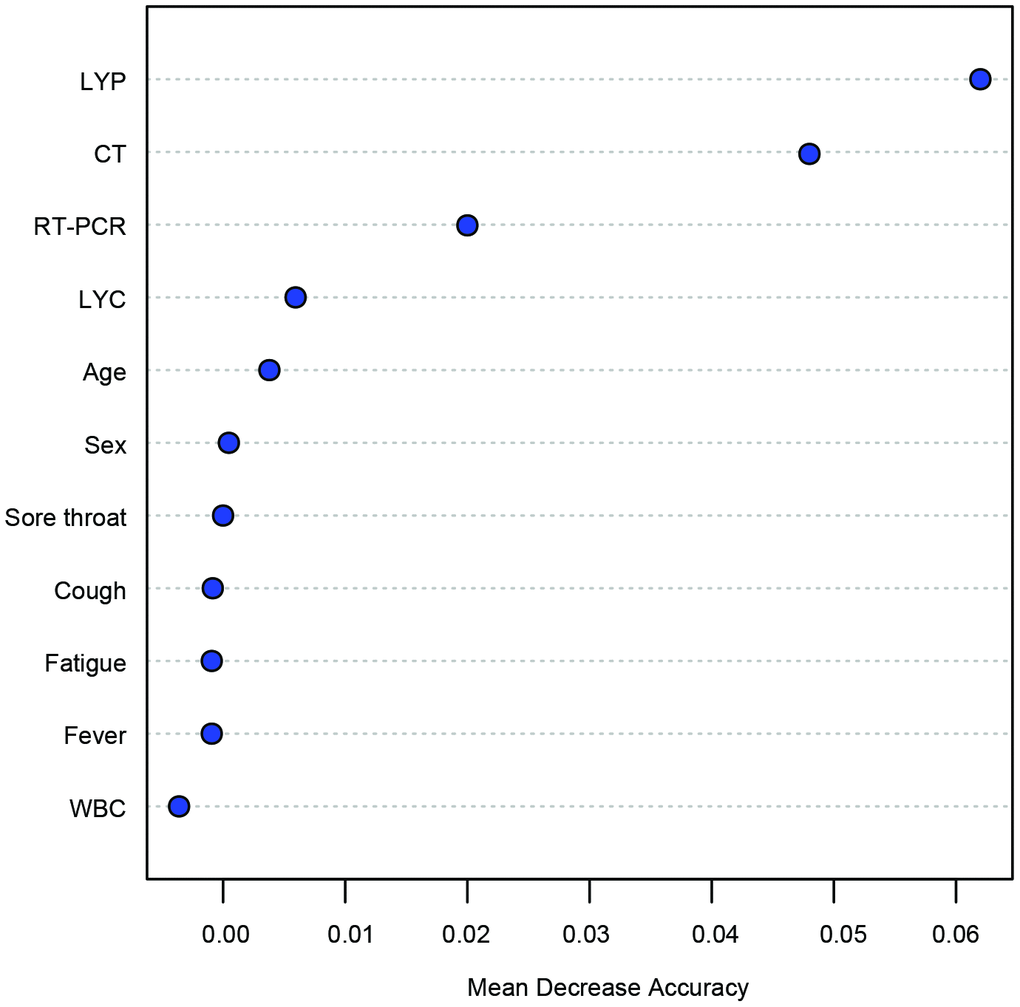 We followed the guidelines for the transparent reporting of a multivariable prediction model for individual prognosis or diagnosis (TRIPOD). The analyses were performed using the randomForest package (version 4.6-14) in R 3.5.19. A total of 16 variables were analyzed for model construction including age, sex, epidemiological record, fever, sore throat, cough, fatigue, LYC, LYP, WBC, first PCR results, and chest CT imaging characteristics. The importance of the features for discriminating COVID-19 from influenza and CAP was ranked based on the mean decrease accuracy (MDA) in the random forest model (1000 trees) [10]. The more the accuracy decreases, the more important the variable. For the cohort collected from Heping Hospital Affiliated to Changzhi Medical College, after all of the 1000 trees have been grown, the biological samples that did not participate in the training of trees are used as an internal validation set to check the error rate for each tree (training/internal validation: 7:3). For external validation, all the subjects were used.