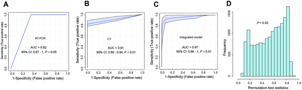 The performance of the single and multi-feature models was assessed using ROC analysis and confusion matrices. Even though the first RT-PCR and CT alone had acceptable AUROCs (0.82 and 0.91), their F1 scores were only 0.66 and 0.67, respectively (Figure 3A, 3B and Table 3); in addition, these two models had low Matthews correlation coefficient (MCC) values (0.67 and 0.64, respectively). Next, we evaluated the performance of the combination of multiple features. Surprisingly, an integrated model with the combination of LYP, RT-PCR, and CT performed well for distinguishing COVID-19 from seasonal flu and CAP, with an AUC of 0.97 (95% CI: 0.86 - 1, P < 0.01) (Figure 3C). The permutation test showed that the integrated model was robust (Figure 3D). Other classification metrics, including the accuracy, sensitivity, specificity, PPV, NPV, F1 score, and MCC, were also higher than those of the models with single features.