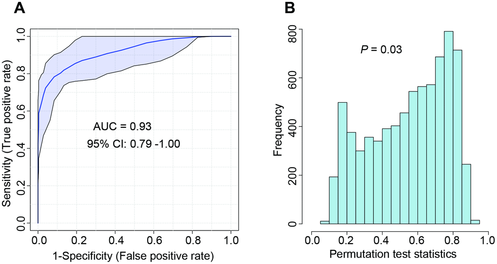 To further validate the feasibility of our model for distinguishing COVID-19 from seasonal flu and community-acquired pneumonia, we recruited another 55 patients from a different medical center. Similarly, the developed model performed well in this independent cohort with an F1 score of 0.80 and an MCC of 0.76 (Table 3). ROC curve analysis showed an AUROC of 0.93 (95% CI: 0.79 – 1.00) (Figure 4A). The reliability of the ROC curve prediction was validated using the permutation test (1000 times) (Figure 4B). The diagnostic accuracy was 92.7% (95% CI: 82.4 – 97.9) in the external validation cohort. The sensitivity and specificity were 88.9% (95% CI: 51.8 – 99.7), and 93.5% (95% CI: 82.1 – 98.6), respectively (Table 3).