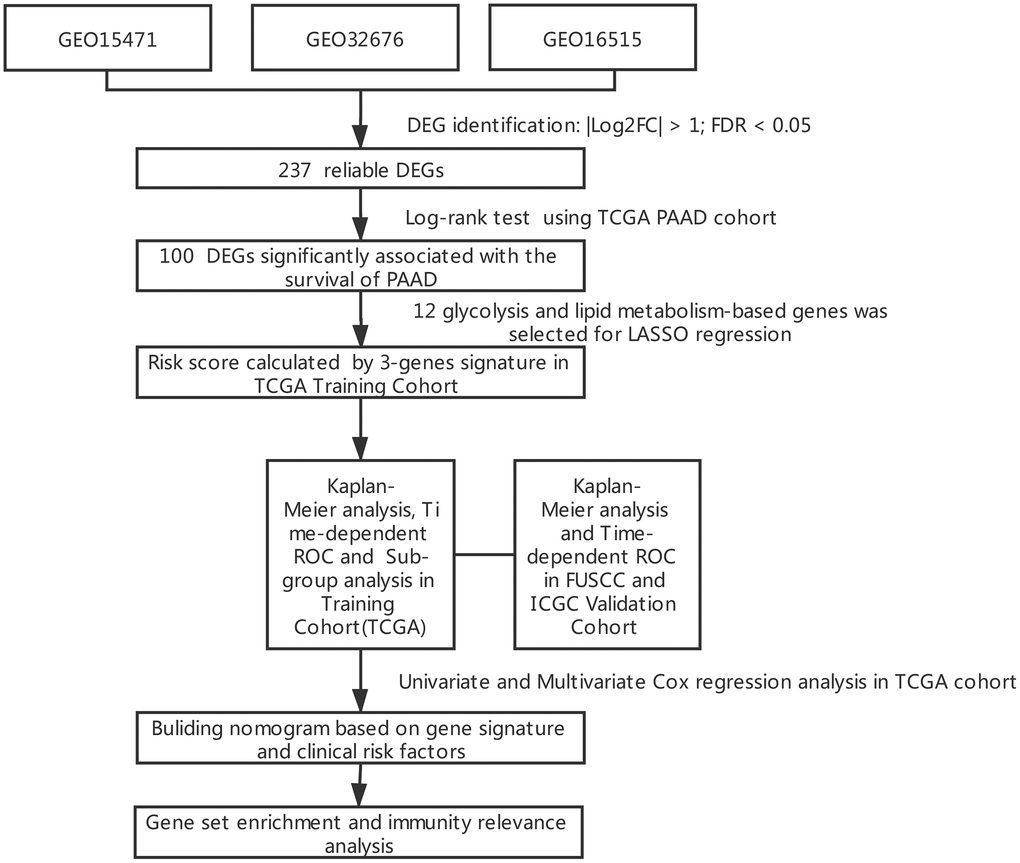 Recent advances in gene chips and high-throughput next-generation sequencing technology have modified the transcriptomic research landscape and demonstrated that mRNA prognostic signatures can help to predict OS in PDAC [1]. Numerous bioinformatics analyses have been conducted to elucidate molecular mechanisms and direct clinical practice [2]. Raman et al. developed a five-gene prognostic model that accurately predicted OS from a PDAC dataset in The Cancer Genome Atlas (TCGA) (the TCGA-PDAC dataset) using Cox proportional hazards regression analysis [3]. Similarly, Yan et al. revealed a four-gene signature (with LYRM1, KNTC1, IGF2BP2, and CDC6) that is significantly related to the progression of pancreatic cancer through the same method [4]. However, this method is not suitable for high-dimensional microarray data because of the limitation of overfitting. The least absolute shrinkage and selection operator (LASSO) regression method does not have this class of limitation and has been broadly used for optimized selection of genes [5]. Notably, PDAC is characterized by an incredibly nutrient-deficient and hypoxic environment caused by vascular disturbances, desmoplastic reactions and unrestrained growth. Oncogenic activation of Kirsten rat sarcoma 2 viral oncogene homolog (KRAS) and mutations in other tumor suppressor genes promote abnormal mitochondrial metabolism and enhance glycolysis and lipid metabolism since these genes are intrinsic components of metabolic plasticity [6]. Reprogramming of metabolic pathways, including enhancement of lipid metabolism and glycolysis, has emerged as a hallmark of cancer [7, 8]. The most common transformation is enhancement of glycolysis, which enables vigorous growth of cells by generating a large variety of substrates and facilitates invasion and migration by affecting glycolytic enzymes to improve the supply of ATP [9, 10]. Biosynthesis, glycosylation and redox homeostasis are also linked to intermediates related to glycolysis. Overexpression of glycolytic enzymes and increased lactate production in PDAC cells promote metastatic colonization of distant organs and tumor angiogenesis by regulating the invasion-metastasis cascade [11]. Fatty acids (FAs) and glycerol are key molecules released by adipocytes and are the main precursors of the lipids used as energy sources by cancer cells. As a result, cancer-associated adipocytes play a role in providing energy for cancer cells since they supply sufficient FAs and lipids to affect the metabolism of tumor cells and promote the growth of malignant tumors. FAs are also used by cells to synthesize membranes and to generate signaling molecules that stimulate the proliferation and invasion of cancer cells. Previous studies have sought to delineate correlations between lipid remodeling and the progression of invasive malignant biological behavior in PDAC. Lipid breakdown and fibrotic changes in the tumor microenvironment enhance the levels of FAs.