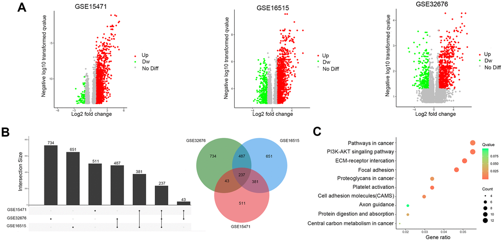The results of this study are summarized in a flow chart (Figure 1). The detailed information in three eligible PDAC datasets in the GEO database (GSE15471, GSE16515, and GSE32676) met our criteria. Analysis of these PDAC datasets revealed that 237 differentially expressed genes (DEGs) were shared among the 3 series of comparisons between tumor and adjacent para-cancerous tissues in the Venn and UpSet diagrams; these DEGs were regarded as credible DEGs (Figure 2A, 2B). In addition, KEGG pathway enrichment analyses were performed for these overlapping up- or down-regulated genes. As shown in Figure 2C, the DEGs were most enriched in the ECM-receptor interaction pathway, the PI3K-Akt signaling pathway and numerous energy metabolism-related pathways, such as the proteoglycans in cancer pathway and the central carbon metabolism in cancer pathway.