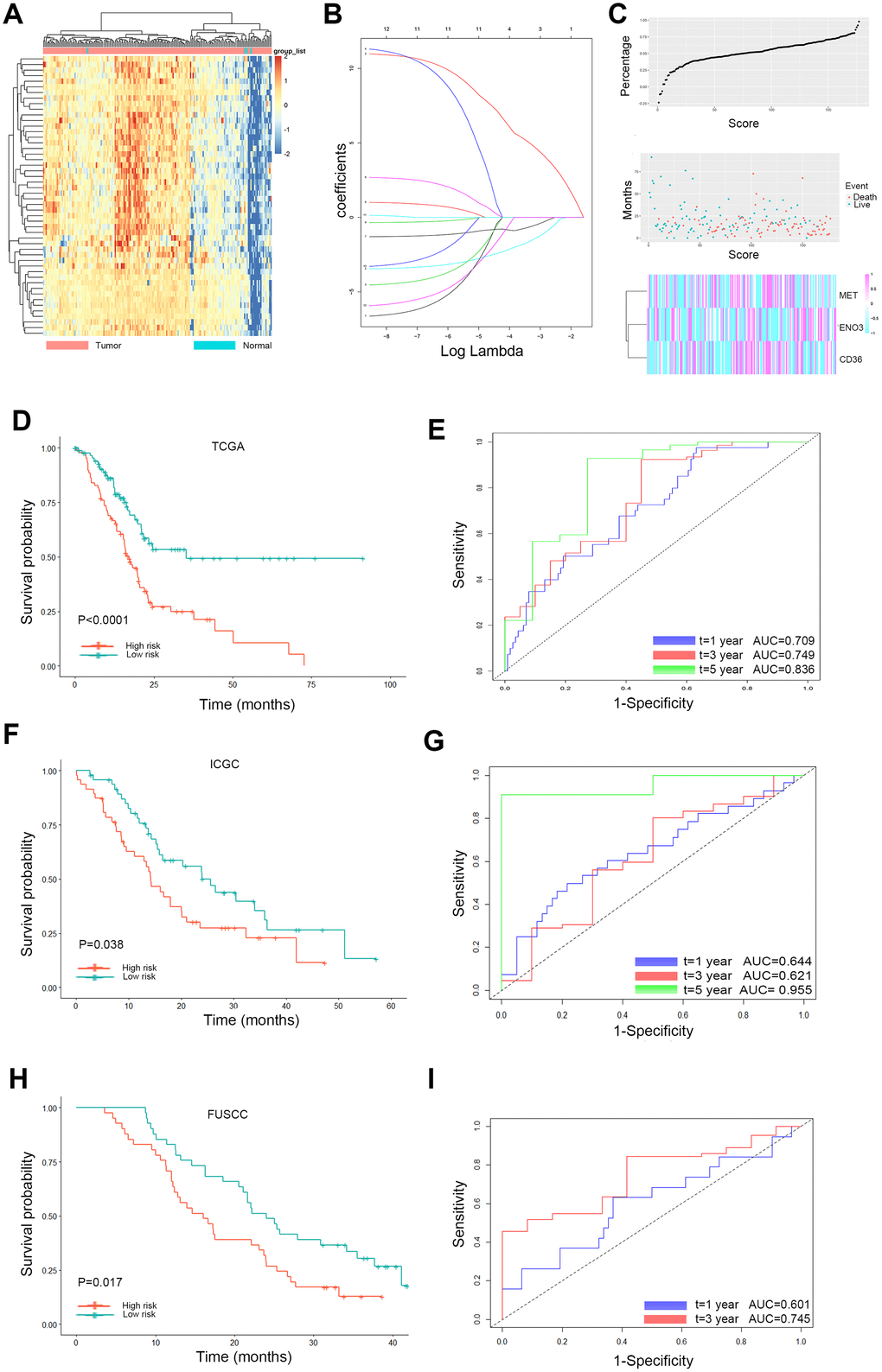 With the median risk score as the cutoff, PDAC patients were classified into a low-risk group (n = 89) and a high-risk group (n = 88) (Figure 3C). Survival analysis confirmed that the survival times of the low risk patients were distinctly longer than those of the high-risk patients in the TCGA discovery cohort (P < 0.0001; Figure 3D). The finding was subsequently validated in ICGC validation datasets; the results obtained for these datasets agreed with those obtained for the discovery cohort (P = 0.038; Figure 3F). The same trend was also verified in the FUSCC validation cohort (P = 0.017; Figure 3H). Furthermore, to evaluate the performance of the three-gene signature in predicting the prognoses of PDAC patients, time-dependent ROC curves with respect to the 1-year, 3-year and 5-year survival rates were constructed for the TCGA, ICGC and FUSCC datasets, and the area under the curve (AUC) values for these curves were evaluated (Figure 3E, 3G, 3I). The AUC at 1, 3, and 5 years was 0.709, 0.749, and 0.836 in the TCGA set, respectively. The AUC at 1, 3, and 5 years was 0.644, 0.621, and 0.955 in the ICGC set, respectively. The AUC at 1 and 3 years was 0.601, 0.745 in the FUSCC set, respectively.