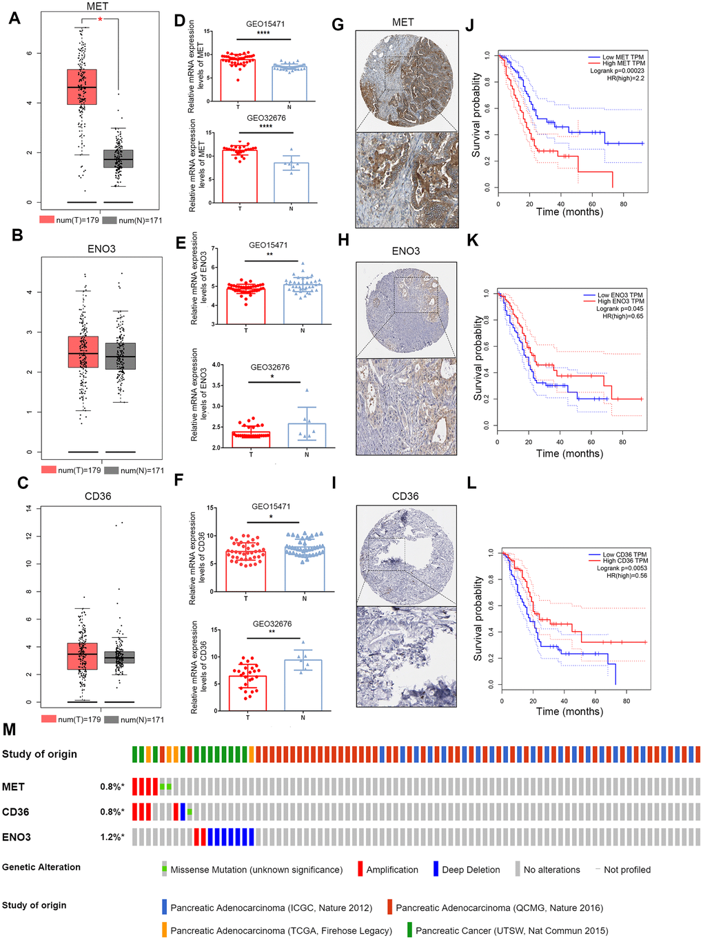 The mRNA expression levels of the three genes were validated using the Gene Expression Profiling Interactive Analysis (GEPIA) database and GEO. In the GEPIA dataset, only MET mRNA expression was significantly elevated in tumor samples (Figure 4A–4C). In the GEO dataset, we found that MET expression levels were significantly higher in PDAC tumor tissue than in paracancerous tissue in the GEO32676 and GEO15471 datasets (Figure 4D). In contrast, the mRNA expression of ENO3 and CD36was markedly down-regulated in tumor tissues (Figure 4E, 4F). Protein expression of the DEGs in pancreatic tumor and non-tumor tissues was evaluated by the Human Protein Atlas (https://www.proteinatlas.org/) [12]. Immunohistochemical (IHC) staining information for the three genes in PDAC from the Human Protein Atlas database is shown in Figure 4G–4I. Moreover, the OS times were also obtained from the GEPIA database (Figure 4J–4L). A total of 848 patients in four cohorts (the ICGC, Queensland Centre for Medical Genomics [QCMG], TCGA and UT Southwestern Medical Center [UTSW] cohorts) were included in this study for analysis of the mutation information of the three glycolysis- and lipid metabolism-related genes. Overall, amplification and deep deletion were the most common types of mutations in MET, CD36 and ENO3 (Figure 4M).