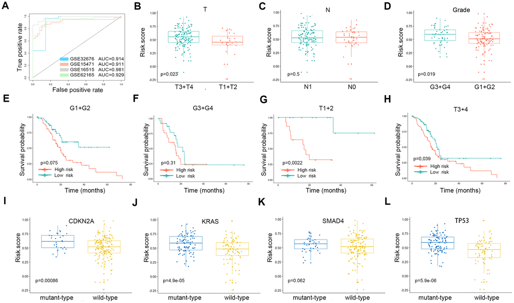 ROC curve analysis was performed with AUCs to evaluate the usefulness of the risk score of the gene signature in distinguishing PDAC tissues from control samples in four GEO cohorts (Figure 5A). Tumor tissues could be reliably identified based on this risk score. Subgroup analyses were performed to assess the three-gene signature and clinical characteristics of pancreatic cancer (including American Joint Committee on Cancer [AJCC] stage and grade) from appropriate datasets. In terms of AJCC stage and grade, stage T3-4 and grade 3-4 patients had higher risk scores than stage T1-2 and grade 1-2 patients. However, the same trend was not noted for N stages (Figure 5B–5D). The Kaplan-Meier curves of these clinical features are shown in Figure 5E–5H. The survival time of the high-risk score group was significantly shorter than that of the low-risk score group for all pathological T stages and for grades 1-2. In terms of mutations, risk scores were observed to be highly correlated with the mutation states of key genes in PDAC. The risk scores for the CDKN2A, KRAS and TP53 mutant groups were significantly higher than that of the wild-type group (Figure 5I–5L).