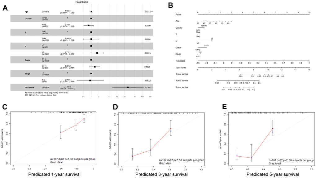 We examined the association of the three-gene signature (risk score) with clinical features in PDAC patients using univariate and multivariate Cox proportional hazard regression analyses. Univariate Cox proportional hazard regression showed that N stage, age, and risk score could predict poor survival of PDAC patients, as shown in Table 2 (P < 0.05). In addition, multivariate Cox proportional hazard regression showed that the risk score (P < 0.001) was an independent prognostic indicator of PDAC (Figure 6A). Based on the results acquired from multivariate Cox regression of OS in the TCGA dataset, we developed a nomogram to predict 1-, 3- and 5-year survival probability in PDAC (Figure 6B). The C-index of our nomogram in the TCGA cohort was 0.689 (95% confidence interval, 0.628-0.749), and the calibration curves for this nomogram presented good agreement between the possibility estimated by the nomogram and the actual proportion (Figure 6C–6E).