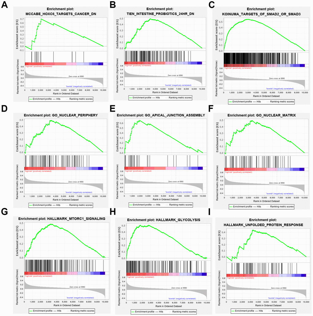 To elucidate the molecular mechanism of the three-gene signature, patients from the TCGA PDAC dataset were divided into high- and low-risk groups according to the cutoff value. GSEA compared the high- and low-risk groups. Gene ontology (GO) gathers information about molecular function, biological processes, and cellular components in a number of different organisms. These enriched gene ontology (GO) data revealed that molecular alteration in the high-risk group was closely related to the nuclear periphery, apical junction and nuclear matrix. Oncological signatures were significantly enriched, including HOXC6, SMAD2, SMAD3 and MTORC (Figure 7).