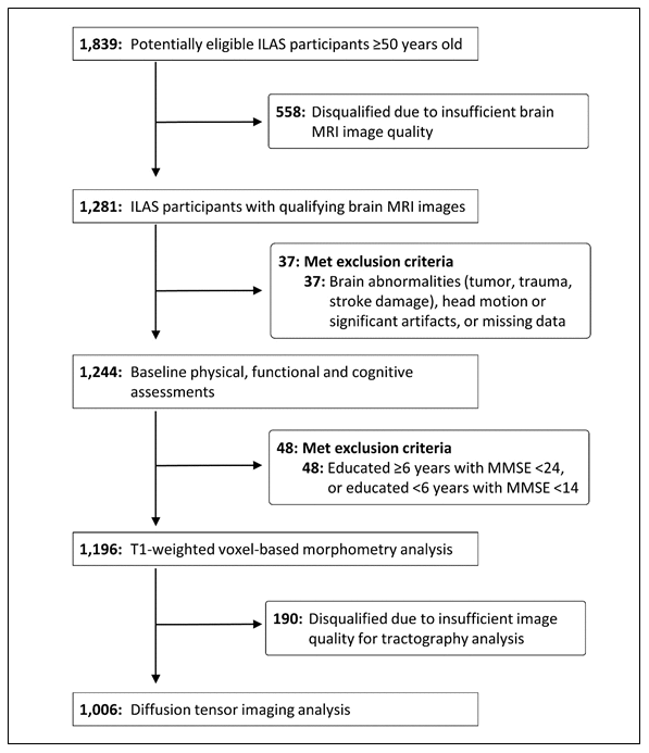 Among 1281 ILAS participants with qualifying brain MRI images, 85 were excluded due to brain abnormalities (infarct, haemorrhage, tumour), head motion or artefacts, dementia, or missing data; the analytic sample comprised 1196 subjects ≥ 50-year-olds who had no dementia or evident physical disabilities (62 ± 9 years old, 47.6% men). Quality screening disqualified a further 190 candidates from subsequent tractography analyses (1196 for GMV analyses and 1006 for tractography analyses; Figure 1).
