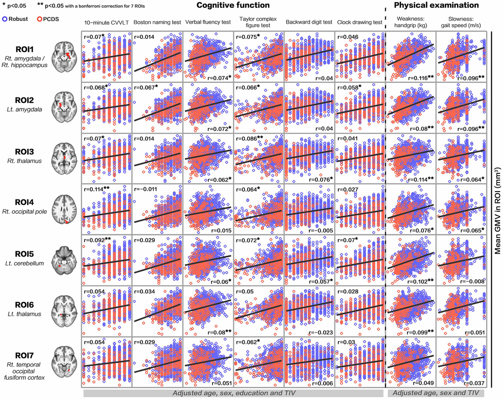 To investigate the potential associations between observed neuroanatomical alterations and each cognitive/physical task in our population, PCDS-associated anatomical regions identified by the above voxel-wise analysis were extracted and averaged for each individual. Partial Pearson’s correlation analyses which adjust corresponded confounding factors (for domains of cognitive functions: age, sex, education and TIV adjusted; for physical examinations: age, sex and TI adjusted) were then used to identify the potential associations between regional GMV measures and multiple domains of cognitive functions (including scores of 10-minute CVVLT, Boston naming test, verbal fluency test, Taylor complex figure test, backward digit test, and clock drawing test) and physical examinations (including handgrip and gait speed) respectively. The statistical significances were reported both with the threshold at an uncorrected P-value<0.05 and a Bonferroni corrected P-value<0.05 (for seven regions).