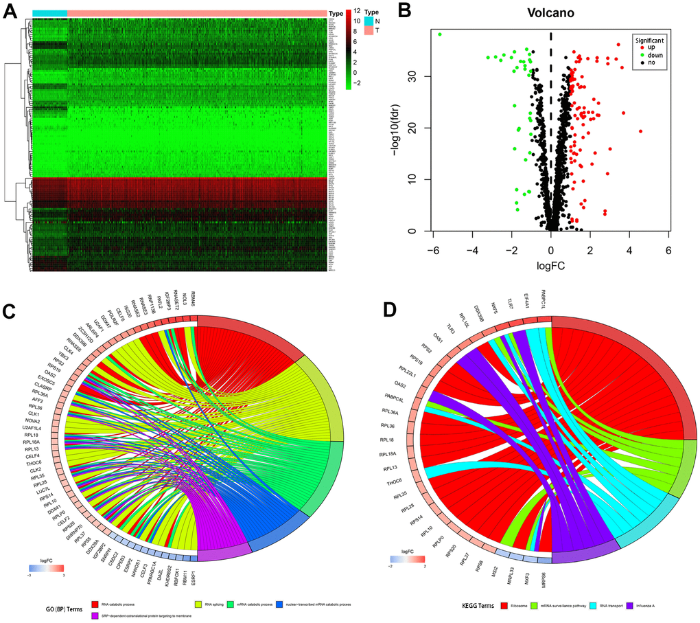 RNA-seq and clinical data from 539 tumor and 72 normal samples were downloaded from TCGA database. A total of 1542 RBPs were included in the present study. Of these, 133 RBPs with |log2FC| > 1.0 and FDR < 0.05 were considered differentially expressed genes; 98 were upregulated and 35 were downregulated. A heatmap and volcano plot showing expression distributions of these differently expressed RBPs are shown in Figure 1A, 1B.