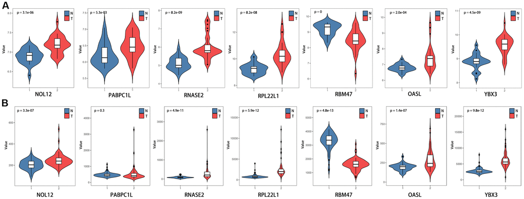 The differentially expressed RBPs were further verified using the GSE36895 (Figure 10A) and GSE53757 (Figure 10B) datasets, which generally yielded results consistent with our previous findings. However, PABPC1L levels did not differ between tumor and normal tissues in the GSE53757 dataset, perhaps due to differences in study populations and measurement scales.