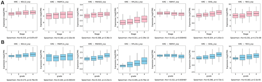 Additionally, we further verified correlations between target RBPs and KIRC tumor grade and AJCC stage using the TISIDB online database. The results indicated that the seven target RBPs were not only closely associated with tumor grade, but also with AJCC stage (Figure 11). NOL12, PABPC1L, RNASE2, RPL22L1, OASL, and YBX3 expression were significantly positively correlated with tumor grade and AJCC stage, while RBM47 expression was negatively correlated with tumor grade and AJCC stage.