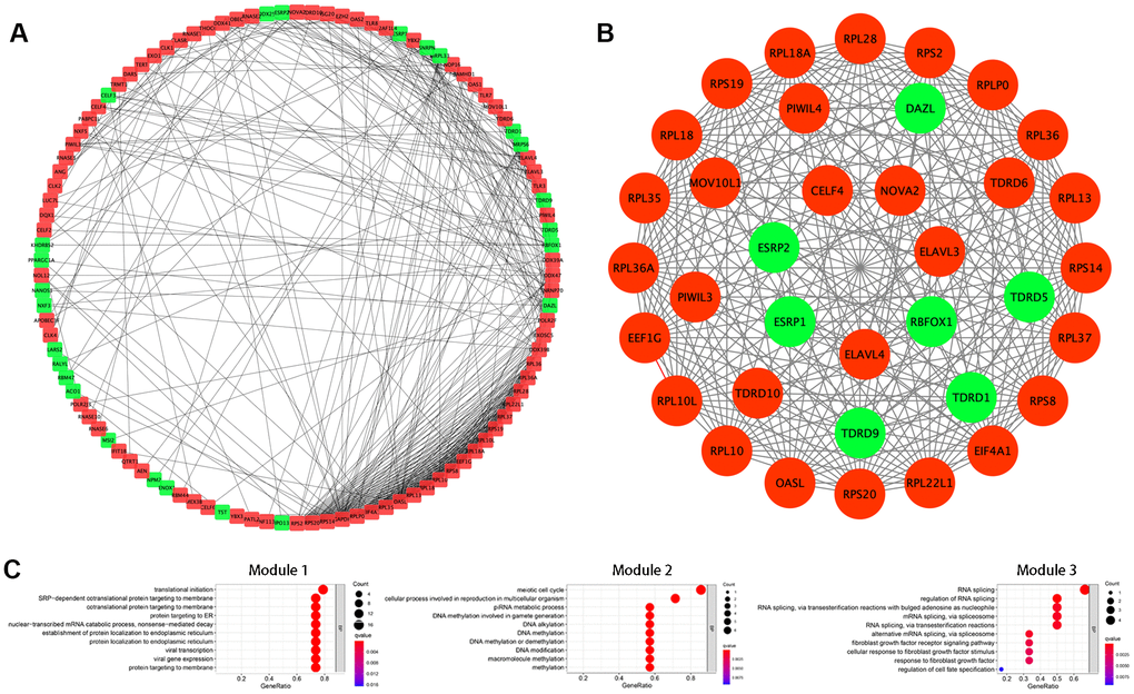 Next, we further explored the effects of the 133 differentially expressed RBPs in KIRC using a PPI network. Interaction relationship data for the RBPs were downloaded from the STRING tool and imported into Cytoscape for visualization. The PPI network consisted of 108 nodes and 463 edges (Figure 2A). We then analyzed the co-expression network further to identify possible key modules using the MODE plugin and identified the three most significant modules (Figure 2B). GO-BP enrichment analysis revealed that the RBPs from module 1 were highly associated with SRP-dependent co-translational protein targeting to the membrane, co-translational protein targeting to the membrane, and protein targeting to the ER. The RBPs in module 2 were mainly enriched in DNA methylation involved in gamete generation, DNA alkylation, and DNA methylation. The RBPs in module 3 were mainly enriched in regulation of RNA splicing, RNA splicing, and alternative mRNA splicing via the spliceosome (Figure 2C).