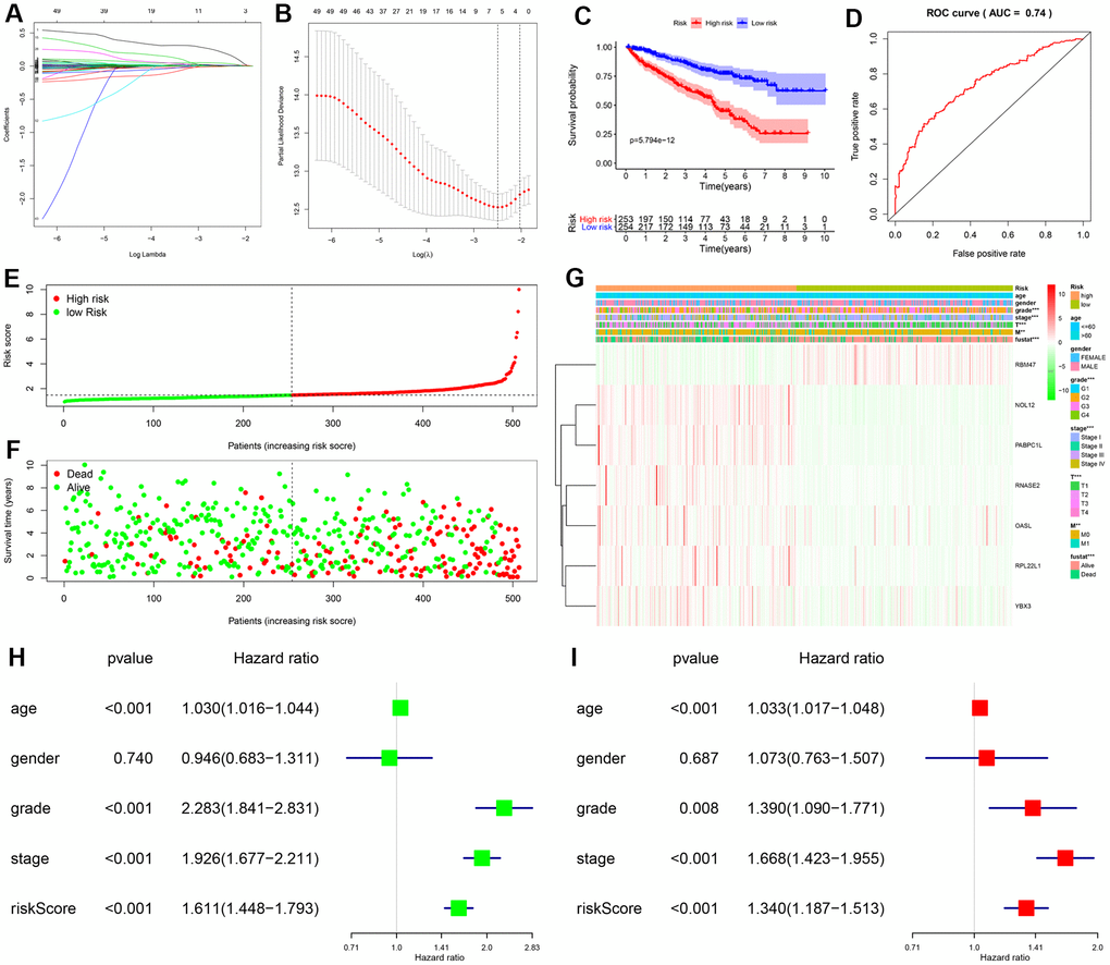 To determine whether the risk score was an independent prognostic factor, we performed univariate and multivariate Cox regression analyses of TCGA data. The univariate analysis showed that age, grade, AJCC stage, and risk score were significantly correlated with OS in KIRC patients (Figure 3H). Furthermore, multivariate analysis indicated that age, grade, AJCC stage, and risk score were all independent prognostic factors for OS (Figure 3I). Collectively, these analyses demonstrated that the risk score based on seven RBPs might serve as an independent prognostic factor for KIRC patient survival.