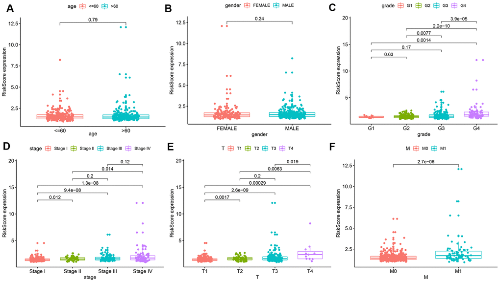 To further explore the prognostic value of the risk model, we analyzed relationships between the risk score and various clinical parameters (Figure 4). The results indicated that risk score was significantly associated with grade, AJCC stage, T stage, and M stage; the higher the risk score, the greater the probability of progression to advanced tumors. However, risk scores were not associated with age or gender.