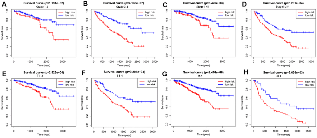 To explore the wider applicability of this risk model, all KIRC patients were classified into several stratified cohorts according to different clinicopathological parameters. Kaplan–Meier survival curves showed that patients in the high-risk group had significantly poorer OS than those in the low-risk group in all subgroups (Figure 5).
