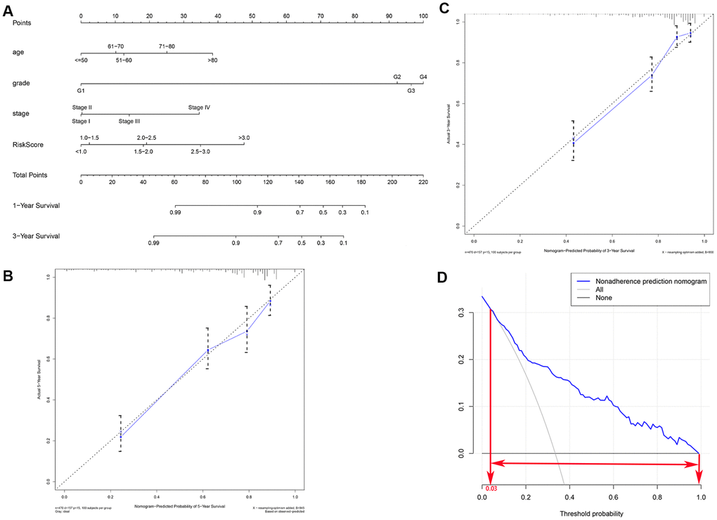 In order to develop a quantitative method for predicting prognosis in KIRC patients, we constructed a nomogram that integrated risk score and the independent predictors identified above (age, grade, and AJCC stage). Each variable was assigned a score; the scores of the four variables were then added, and a vertical line was drawn from the total score to the nomogram points scale to determine estimated 3-year and 5-year survival rates (Figure 6A). The C-index value of the prediction nomogram was 0.792 for the KIRC cohort, indicating that it had good discrimination capability. The calibration curves indicated that the nomogram predictions were very consistent with actual observations for 3- and 5-year OS in the TCGA-KIRC cohort, suggesting that the nomogram was reliable (Figure 6B, 6C). Additionally, DCA was used to evaluate the clinical efficiency of the predictive nomogram. The results showed that the nomogram could improve prognosis predictions for patients with a threshold probability of > 3% (Figure 6D).