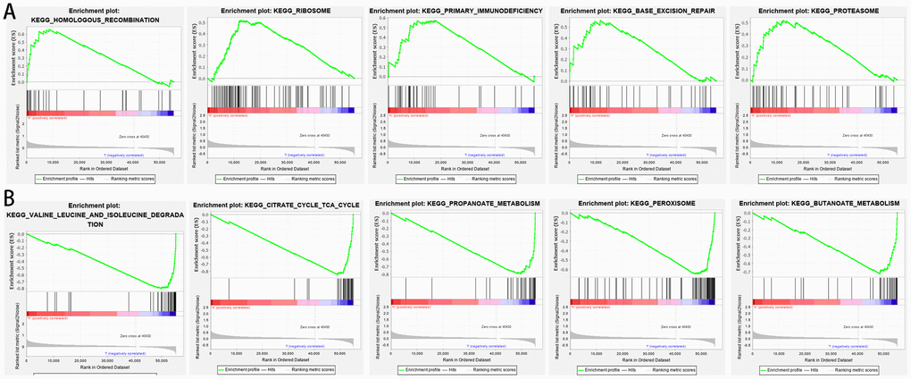 GSEA was performed to further understand functional differences between the high- and low-risk groups identified by the prognostic model. High risk scores were significantly associated with homologous recombination (NES=1.878, P=0.000), ribosome (NES=1.763, P=0.000), primary immunodeficiency (NES=1.714, P=0.001), base excision repair (NES=1.669, P=0.004), and proteasome (NES=1.628, P=0.005) (Figure 7A). Meanwhile, low risk scores were closely associated with valine leucine and isoleucine degradation (NES=-3.3150, P=0.000), citrate cycle (NES=-3.262, P=0.000), propanoate metabolism (NES=-3.189, P=0.000), peroxisome (NES=-2.997, P=0.000), and butanoate metabolism (NES=-2.948, P=0.000) (Figure 7B). Interestingly, several metabolic processes were associated with the low-risk group; these pathways merit further investigation.