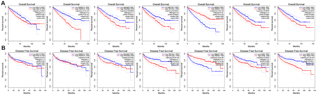To further explore the prognostic value of the target RBPs in KIRC, survival plots were used to evaluate relationships between RBPs and OS in the GEPIA database. Log-rank tests indicated that higher PABPC1L, RNASE2, RPL22L1, YBX3, and OSAL expression was associated with shorter OS. In this analysis, higher RBM47 expression was also associated with shorter OS. However, no significant differences in OS were observed between patients with high and low NOL12 expression (Figure 8A). Similar trends were also observed between RBPs and disease-free survival (DFS) in the GEPIA database. Log-rank tests suggested that higher RNASE2, RPL22L1, YBX3, and OSAL expression was associated with shorter DFS. Again, higher RBM47 expression was also associated with shorter DFS. No significant differences in DFS were observed between patients with high and low NOL12 and PABPC1L expression (Figure 8B).