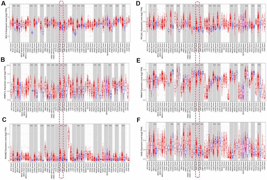 We used ‘DiffExp module’ from the TIMER database to examine the expression of the seven target RBPs in multiple tumors, including KIRC. Consistent with the above results, NOL12, PABPC1L, RNASE2, RPL22L1, and OSAL expression were significantly increased, while RBM47 expression was significantly decreased (Figure 9). YBX3 expression data was not available in the TIMER database, so it was excluded from this analysis. Interestingly, aberrant RBP expression was common in various malignancies and exhibited some degree of tissue specificity. For example, OASL was overexpressed in breast cancer and esophageal cancer, but reduced in colon cancer and lung cancer.