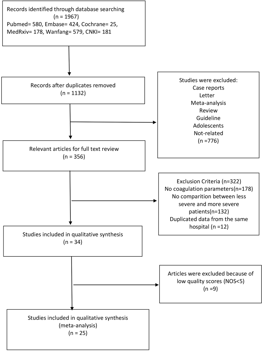 The detailed steps of literature search are highlighted in the flow diagram (Figure 1). Using different search strategies and six different databases, 1,967 COVID-19 articles were identified. After eliminating duplicate records, 1,132 articles were obtained. In addition, 776 articles were excluded because they were not original studies or were irrelevant to our meta-analysis. Full texts of the remaining 356 articles were assessed for eligibility, out of which 322 articles were eliminated because they did not meet the exclusion criteria. A total of 34 articles were included in the quality evaluation (Supplementary Table 2), out of which 9 articles were excluded due to a low quality (NOS<5). Finally, 25 articles (1 in Chinese and 24 in English) were selected for the analyses [6, 8–31]. The overall quality of the selected studies was moderate to high, with NOS scores ranging from 5-7.