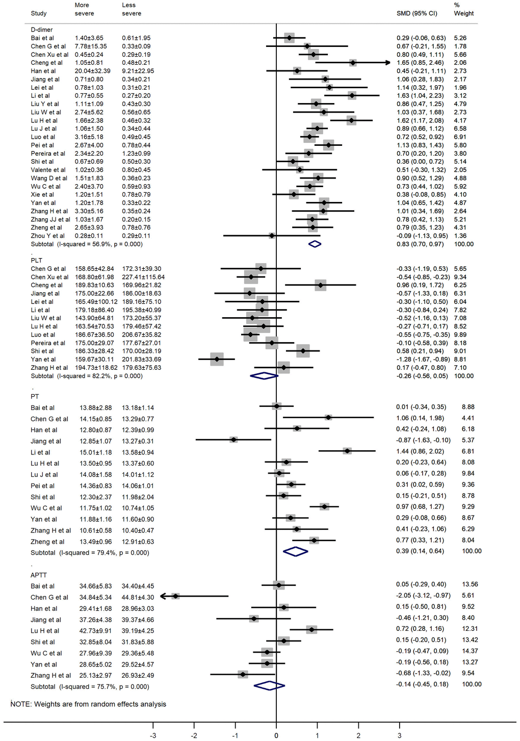 Based on location, severity criteria, and patient age (the median age above and below 50), we conducted a subgroup analysis to determine the sources of heterogeneity. The results of subgroup analysis are presented in Table 2. Notably, the heterogeneity was significant in the subgroup analyses. However, the subgroup analyses did not explain the observed heterogeneity of D-dimer, PLT, PT, and APTT values.