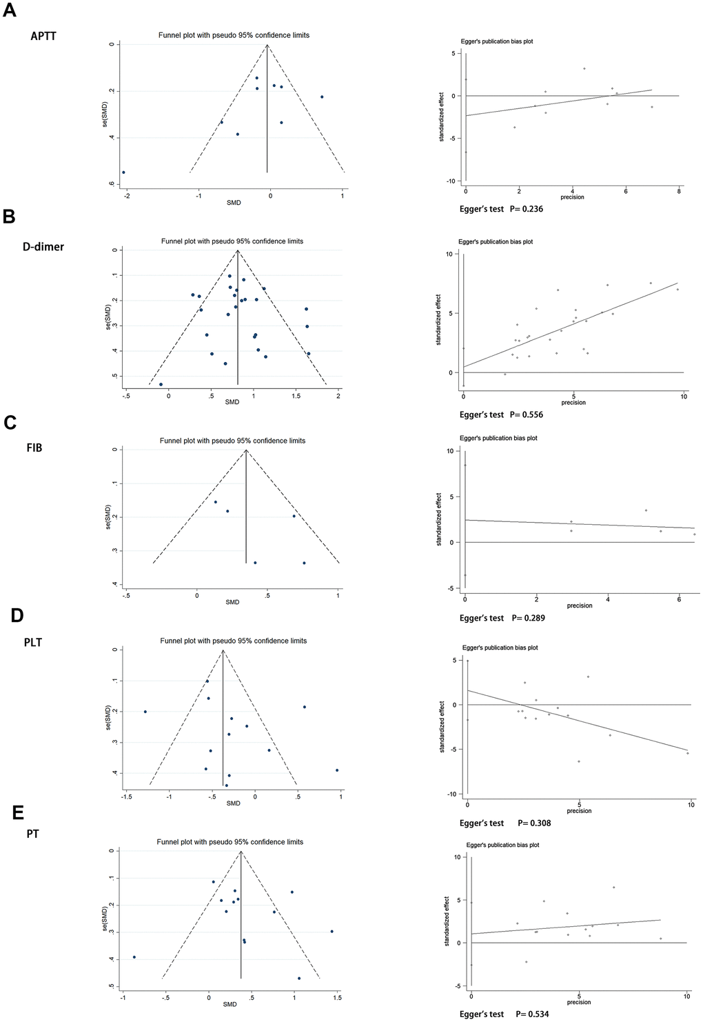 Sensitivity analysis showed that the pooled results were not sensitive to any individual study, thus validating the robustness of the study findings. Detailed results of sensitivity analysis are shown in Supplementary Figure 1. In addition, we assessed publication bias using the funnel plots and Egger’s regression test. There was no significant publication bias among the APTT, D-dimer, FIB, PLT, and PT values in our study (Egger test: P = 0.236, P = 0.556, P = 0.289, P = 0.308, P = 0.534, respectively). The funnel diagram and Egger’s test are shown in Figure 4.
