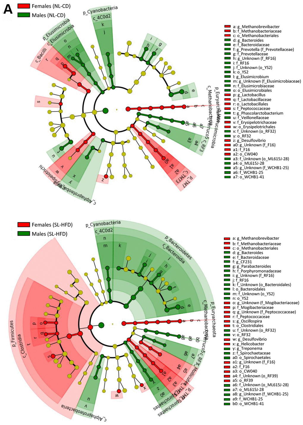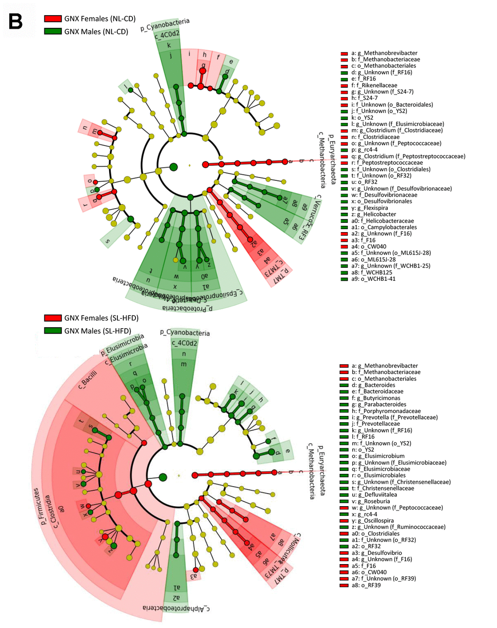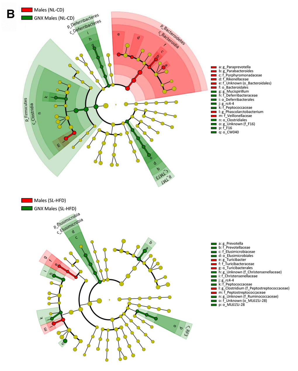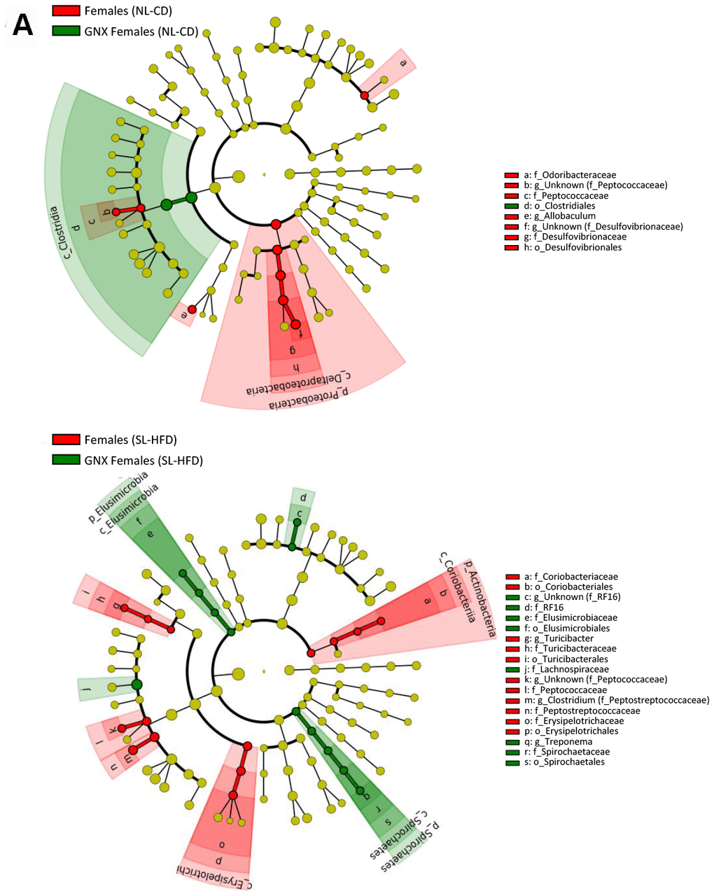 LEfSe analysis between sexes under normal feeding and overfeeding conditions in gonadectomized () animals. Cladogram representing the taxonomic hierarchical structure of the identified differences between genders using Linear discriminant analysis effect size (LEfSe). Each filled circle represents one phylotype. Red denotes bacterial taxa statistically overrepresented in females; green denotes bacterial taxa overrepresented in males. Phylum and class are indicated by their names on the cladogram and the order, family, or genus are given in the key.