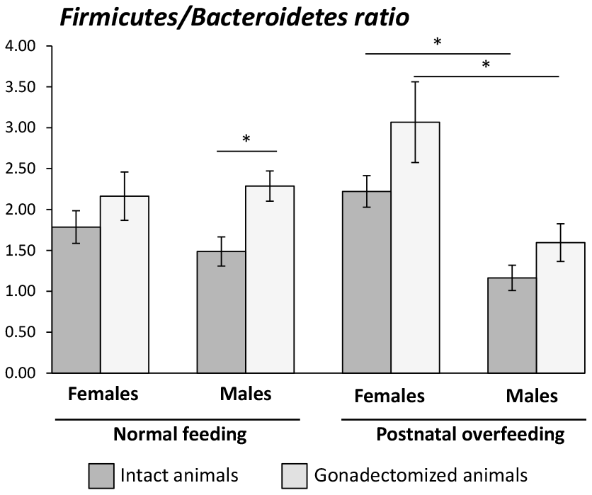 Our study documents that many of the differences in the gut microbiota found between males and females, both under normal and overfeeding conditions, persisted after gonadectomy. However, removing the sex hormones shaped several gut microbiota features towards a more deleterious profile, especially in females, mainly when animals were subjected to postnatal overfeeding. In addition, our study also shows that overnutrition in females significantly increased F/B ratio as compared with males.