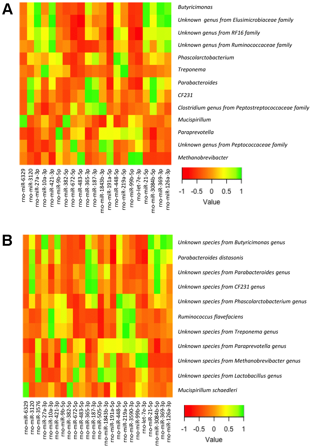 The PASW statistical software package, version 20.0 (IBM Inc., Chicago, IL, USA), was used for statistical analysis of the data. We used One-way ANOVA to test the differences in the plasma metabolites between groups of animals. Pearson’s correlation test was used to evaluate the relationship between miRNA intestinal expression and bacterial taxa abundance. Data are presented as mean ± standard error of the mean. P-values <0.05 were considered statistically significant in all the statistical analyses.