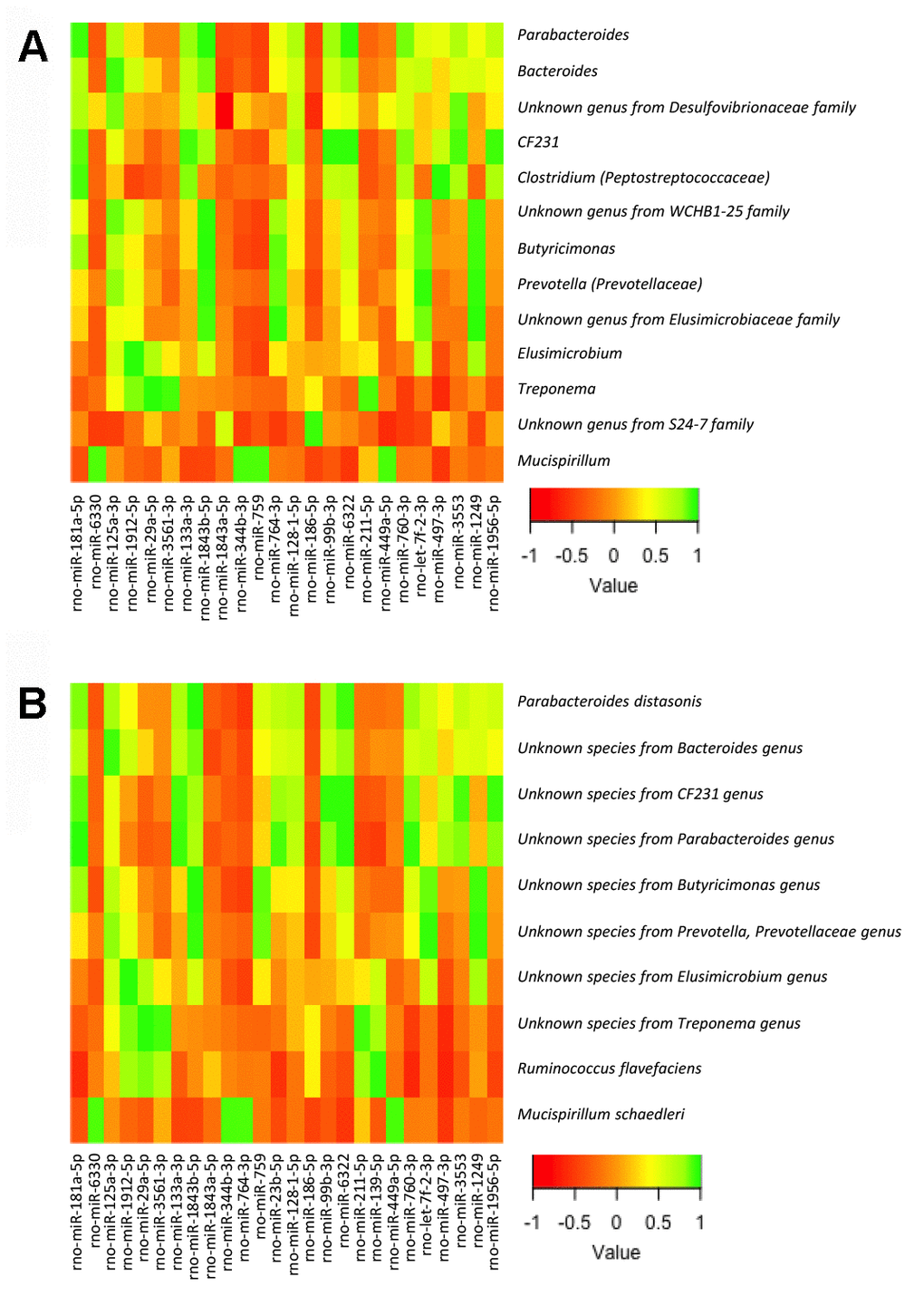 We also explored whether the dialogue, or cross-talk, between gut microbiota and host organism in response to changes in sex hormones and nutritional status can take place through regulation of miRNA expression in the small and large intestines, which is increasingly recognized as transmitters or decoders of dysbiosis into cardiometabolic diseases [35, 36]. Based on KEGG pathways, our study identified miR-23b-5p and miR-186-5p, expressed in the small intestine, as potential modulators of steroid biosynthesis, in response to gut microbiota changes. In fact, we found a relationship in terms of abundance-expression of these miRNAs with an unknown bacterial species from the Parabacteroides genus (in the case of miR-23b-5p) and with an unknown genus from the S24-7 family (miR-186-5p). These findings point out that these bacterial taxa might be related in modulating steroid biosynthesis. In addition, the expression in small intestine of another two miRNAs, miR-181a-5p and miR-139-5p, both involved in the estrogen signaling pathway, was related with the intestinal abundance of Parabacteroides and Clostridium (from Peptostreptococcaceae family) in the first case, and with Ruminococcus flavefaciens in the second.