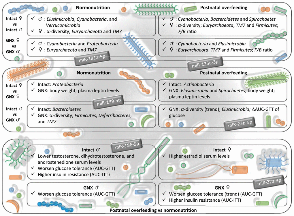 Finally, we evaluated the potential role of miRNAs on the dialogue (cross-talk) between gut microbiota and host organism in response to changes in sex hormones and nutritional status.
