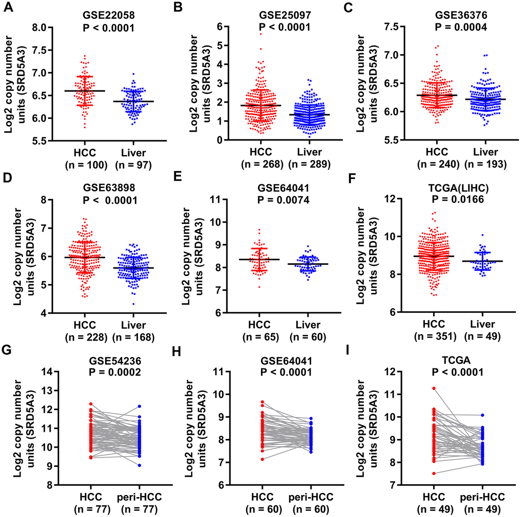 In the current study, SRD5A3 expression in different cancers including HCC was analyzed by bioinformatics, and further verified with clinical specimens of HCC tumor (HCC) and corresponding adjacent non-HCC liver (peri-HCC). Then, the correlation between SRD5A3 expression, clinical progression of HCC and survival prognosis of different cancer patients were studied. Furthermore, we examined the biological effects of SRD5A3 on HCC growth through in vitro and in vivo experiments. Finally, the molecular mechanisms behind these biological functions were explored.