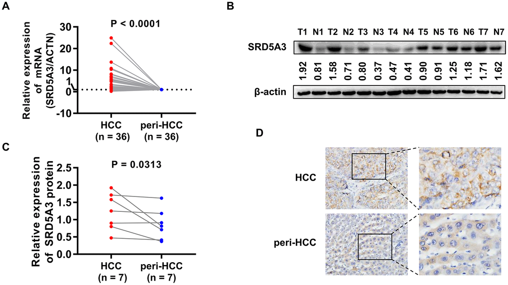 Total RNA was extracted from HCC tumor tissues and corresponding adjacent non-HCC liver tissues following the instruction of TRIzol reagent (Cat. no. T9109, TaKaRa, USA). The reverse transcription of mRNA was performed by using PrimeScript RT Master Mix Kit (Cat. no. RR036A, TaKaRa, USA). The cDNA generated above was used as a template to detect the mRNA expression of SRD5A3 with TB Green™ Premix Ex Taq™ detection kit (Cat. no. RR420A, TaKaRa, USA). β-actin gene acts as an internal control. Primer sequences were as follows: SRD5A3 (forward primer: 5′-TTTAATCAGGCCCTGTCTGC-3′, reverse primer: 5′-GGGGTATAGAAATGGAATGGAGA-3′); β-actin (forward primer: AGCGAGCATCCCCCAAAGTT, reverse primer: GGGCACGAAGGCTCATCATT). These primers were synthesized by RuiBiotech (China). The relative expression of SRD5A3 mRNA level was computed according to the 2-ΔΔCт method.