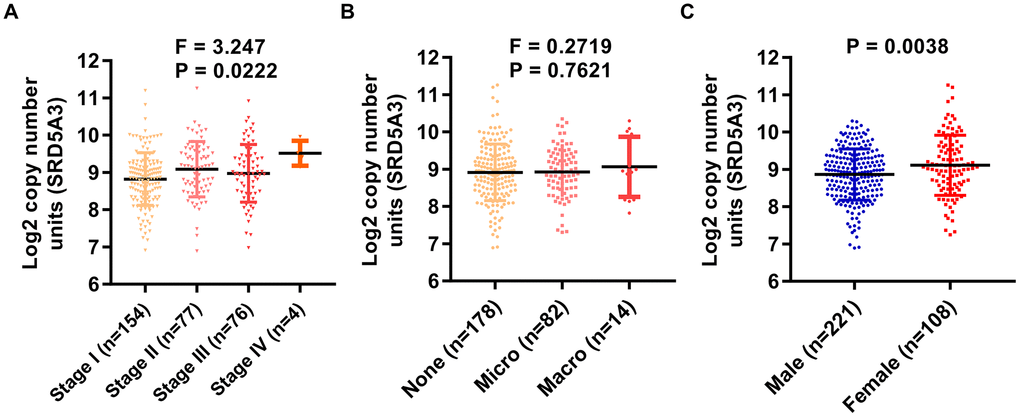Next, the association between SRD5A3 expression and corresponding clinicopathological characteristics was evaluated. We found that the expression of SRD5A3 had a significant correlation with the clinical stage of HCC (P = 0.0222, F = 3.247, Figure 4A). Moreover, as vascular invasion intensified, the average expression of SRD5A3 seemed to increase; however, no significant statistical difference was detected among them (Figure 4B). Interestingly, we found that the expression of SRD5A3 was also associated with the patient's gender (Figure 4C). The average expression of SRD5A3 in female HCC patients tended to be higher than that of male HCC patients (Figure 4C).