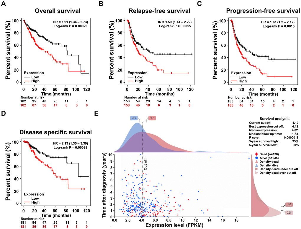 To confirm the correlation between the SRD5A3 expression and the prognosis of HCCs, survival rates between the high and low SRD5A3 level groups were compared. We performed these analyses on the Kaplan–Meier plotter survival analysis platform, and found that HCC patients in the high SRD5A3 expression group had poorer overall survival (OS, HR = 1.91 (1.34 – 2.73), log-rank test P = 0.00029), relapse-free survival (RFS, HR = 1.59 (1.14 – 2.22), log-rank test P = 0.0055), progression-free survival (PFS, HR = 1.61 (1.20 – 2.17), log-rank test P = 0.0015) and disease specific survival (DSS, HR = 2.13 (1.35 – 3.39), log-rank test P = 0.00098) rates than that in the low SRD5A3 expression group (Figure 5A–5D). These were consistent with the data of HCC in the Human Protein Atlas database (Figure 5E), which again indicated that up-regulation of SRD5A3 expression predicts poor prognosis of HCC.