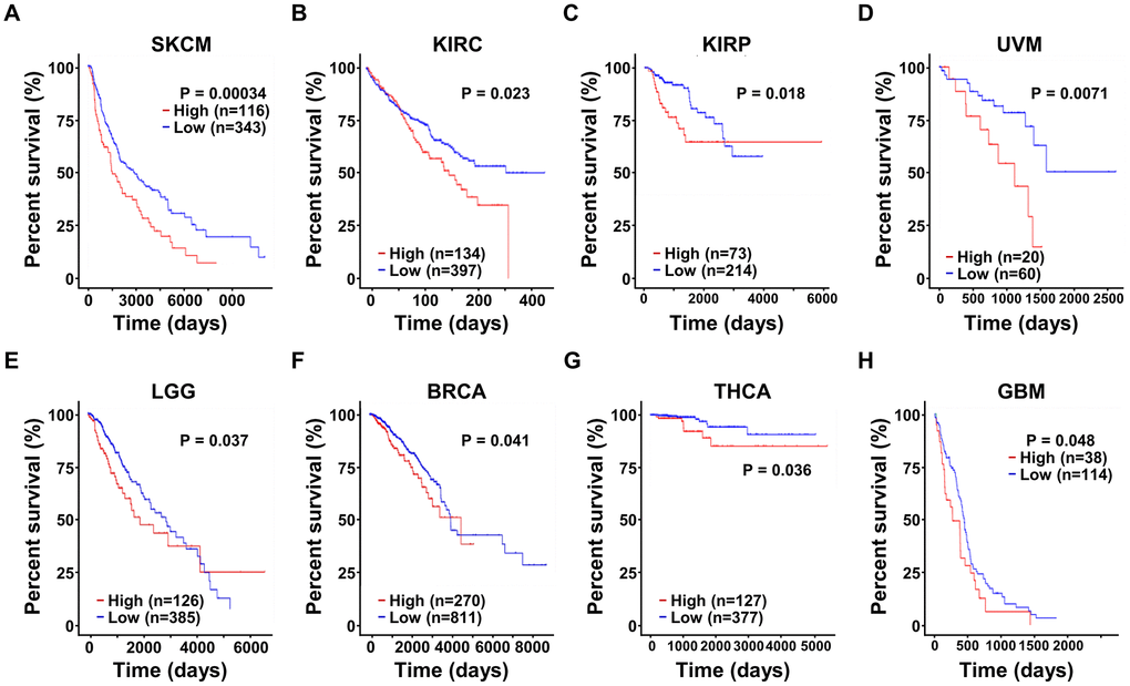 Moreover, we also explored the prognostic significance of SRD5A3 in other cancers, and found that the high expression of SRD5A3 was associated with the poor OS rates of skin cutaneous melanoma (SKCM, P = 0.00034), kidney renal clear cell carcinoma (KIRC, P = 0.023), kidney renal papillary cell carcinoma (KIRP, P = 0.018), uveal melanoma (UVM, P = 0.0071), brain lower grade glioma (LGG, P = 0.037), breast invasive carcinoma (BRCA, P = 0.041), thyroid carcinoma (THCA, P = 0.036), and glioblastoma multiforme (GBM, P = 0.048) (Figure 6A–6H). These results suggested that high expression of SRD5A3 may be a common unfavorable prognostic factor for many different types of cancer.