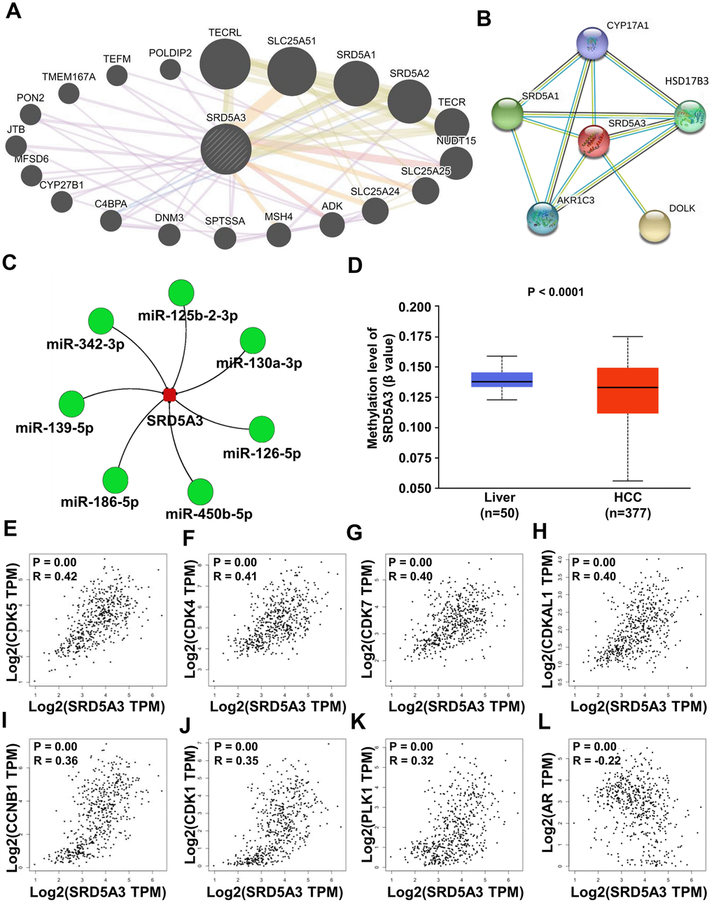 Finally, the potential molecular mechanisms behind the effects of SRD5A3 in HCC were predicted. The GeneMANIA and STRING databases showed that SRD5A3 might interact with TECRL, SLC25A51, SRD5A1, SRD5A2, TECR, NUDT15, SLC25A25, SLC25A24, ADK, MSH4, SPTSSA, DNM3, C4BPA, CYP27B1, MFSD6, JTB, PON2, TMEM167A, TEFM, POLDIP2, SYP17A1, HSD17B3, DOLK, AKR1C3, SRD5A1 and etc. (Figure 9A, 9B). Moreover, the miRNACancerMAP web portal predicted several more reliable microRNAs upstream of SRD5A3 based on the TCGA(LIHC) dataset. These microRNAs included miR-125b-2-3p, miR-130a-3p, miR-126-5p, miR-450b-5p, miR-186-5p, miR-139-5p and miR-342-3p (Figure 9C). And the UALCAN web portal showed that SRD5A3 was hypomethylated in HCC tissues (Figure 9D), suggesting that the high level of SRD5A3 in HCC might be related to the hypomethylation status. Moreover, the GEPIA2 web portal showed that SRD5A3 was positively correlated with some genes such as PPIAP22 (R=0.56, P<0.05), EIF3K (R=0.56, P<0.05), KIAA1522 (R=0.54, P<0.05), MYL6 (R=0.54, P<0.05), PPIA (R=0.53, P<0.05), MRPS12 (R=0.53, P<0.05), SUMF2 (R=0.53, P<0.05), RRP36 (R=0.53, P<0.05), ORMDL2 (R=0.53, P<0.05) and etc. (Table 1). Some of them were genes related to the cell cycle, including CDK5 (R=0.42, P<0.05), CDK4 (R=0.41, P<0.05), CDK7 (R=0.40, P<0.05), CDKAL1 (R=0.40, P<0.05), CCNB1 (R=0.36, P<0.05), CDK1 (R=0.35, P<0.05) and PLK1 (R=0.32, P<0.05) (Figure 9E–9K and Table 1). Additionally, AR expression was found to have a negative correlation with SRD5A3 (Figure 9L and Table 1).