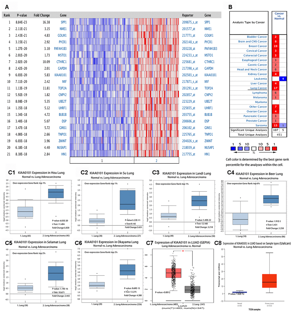 Figure 1A shows a heat map of multiple genes that were overexpressed in LUAD. The top 23 ranked differentially expressed genes were obtained based on the log2 median centered ratio. After a genome-wide analysis, we identified these 23 genes, including KIAA0101, which were overexpressed in LUAD (Figure 1A, red text genes). We used Oncomine to analyze the expression distribution of KIAA0101 mRNA in different tumors (Figure 1B). Oncomine collected these datasets from public repositories such as Gene Expression Omnibus (GEO) and Array Express. The results showed that when comparing cancer samples with normal samples, KIAA0101 was overexpressed in 17 LUAD datasets, but was not under-expressed in any of the LUAD datasets (Figure 1B). The thresholds were a P value less than 0.001, fold change greater than two, and gene rank in the top 10%. All results were statistically significant. The results were analyzed statistically using Student's t test. The mRNA expression level of KIAA0101 was significantly higher in LUAD than in normal tissues. Figure 1C1–1C8 show the data from Oncomine, GEPIA, and Ualcan comparisons of KIAA0101 mRNA levels between eight different gene sets of adenocarcinoma and normal tissues. All the results showed that the expression level of KIAA0101 in LUAD tissues was significantly higher than that in normal lung tissues, as assessed using Student's t test. Further analysis of various clinical features of LUAD in the TCGA showed that KIAA0101 was highly transcribed. In subgroup analysis based on stage, race, sex, age, smoking habit, and metastasis in the UALCAN database, the transcription level of KIAA0101 in patients with LUAD was significantly higher than that in healthy people (Supplementary Figure 14A–14F). Therefore, the expression of KIAA0101 could be used as a potential diagnostic marker for LUAD [14].
