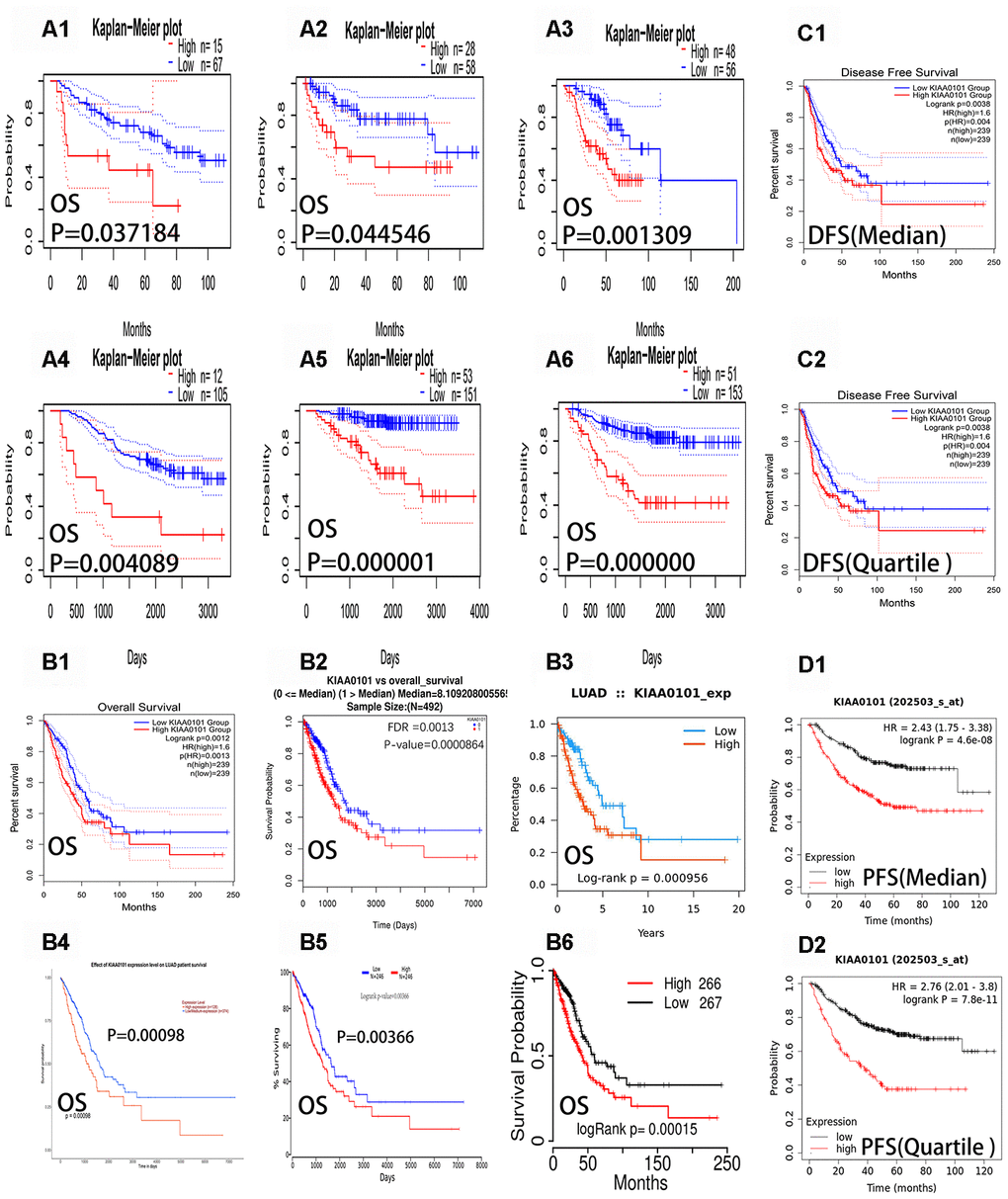 Our next analysis showed that the expression of KIAA0101 had a significant effect on the prognosis of LUAD (Table 1). Figure 2A1–2A6 show the overall survival curve of five datasets (Jacob-00182-CANDF, MICHIGAN-LC, Jacob-00182-MSK, GSE13213, GSE31210) and the relapse free survival curve of GSE31210 datasets. (Figure 2A1–2A6) show six survival curves representing the five different data sets in Table 1 (from the PrognoScan[15] database). We could observe the blue curves (low expression) were higher than the red curves (high expression) in the Kaplan-Meier plots (Figure 2A1–2A6). In addition, we could see from Table 1 that all six Hazard Ratios (HR) were greater than 1.4, the HR [95% confidence interval (CI)-low CI-up] range was greater than one. The Cox p-values were less than 0.05, indicating statistical significance. The results showed that low expression of KIAA0101 was associated with a good prognosis in patients with LUAD. Figure 2B1–2B6 show the overall survival curves of patients using data from the GEPIA [16], LinkedOmics [17], Ualcan [14], TISIDB [18], OncoLnc [19], and TCGA portal [20] databases. We found that patients with LUAD with low KIAA0101 expression had a better prognosis than those with high KIAA0101 expression in six the overall survival (OS) curves (P-value < 0.01). Figure 2C1 and 2C2 show the disease free survival curves (DFS) of patients using data from the GEPIA database. Figure 2D1 and 2D2 show the progression free survival curves (PFS) of patients using data from Kaplan Meier-plotter. We found that patients with LUAD with low KIAA0101 expression had a better prognosis than those with high KIAA0101 expression in four survival curves (P-value < 0.01). These curves reflect the fact that high expression of KIAA0101 is associated negatively with the prognosis of patients with LUAD.