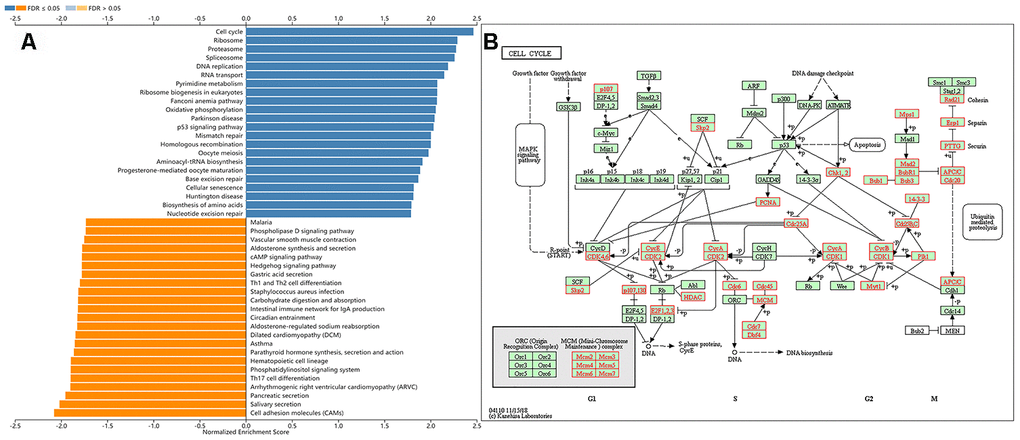 (using LinkedOmics [17]). Table 2 shows the top five most significant of the seven GSEA results. All the results were statistically significant; the normalized enrichment scores (NES) were all greater than one; the P-values were all less than 0.05, and the false discovery rates (FDR) were all less than 0.05. Figure 3A shows a bar graph of the Kyoto Encyclopedia of Genes and Genomes (KEGG) enrichment analysis. Supplementary Figure 2A–2P display the enrichment plot of pathways in the enrichment results from Figure 3A, with the top 8 and the bottom 8 according to the normalized enrichment score. We observed that the top five pathways of the KEGG [21] enrichment analysis were the cell cycle (Figure 3B), ribosome (Supplementary Figure 3), proteasome (Supplementary Figure 4), spliceosome (Supplementary Figure 5), and DNA replication (Supplementary Figure 6). The gene ontology (GO) results for the gene sets (Cellular Component) included condensed chromosome, chromosomal region, mitochondrial protein complex, ribosome, and spindle. The GO results for the gene sets (Biological Process) included chromosome segregation, DNA replication, cell cycle checkpoint, double-strand break repair, and spindle organization. The GO results for the gene sets (Molecular Function) included structural constituent of ribosome, catalytic activity, acting on DNA, single-stranded DNA binding, helicase activity and catalytic activity, and acting on RNA. Kinase targets included CDK1 (cyclin-dependent kinase 1), PLK1 (polo-like kinase 1), AURKB (aurora kinase B), CDK2 (cyclin-dependent kinase 2), and ATR (ATR serine/threonine kinase). MicroRNA targets included MIR-484, MIR-512-3P, MIR-19A, MIR-19B, MIR-219, and MIR-326. Transcription factor targets included E2F Q6, E2F Q4, E2F4DP1 01, E2F1 Q6, and E2F 02. Supplementary Tables 2–8 show the details of all Leading Edge Genes specifically contained in each gene set.