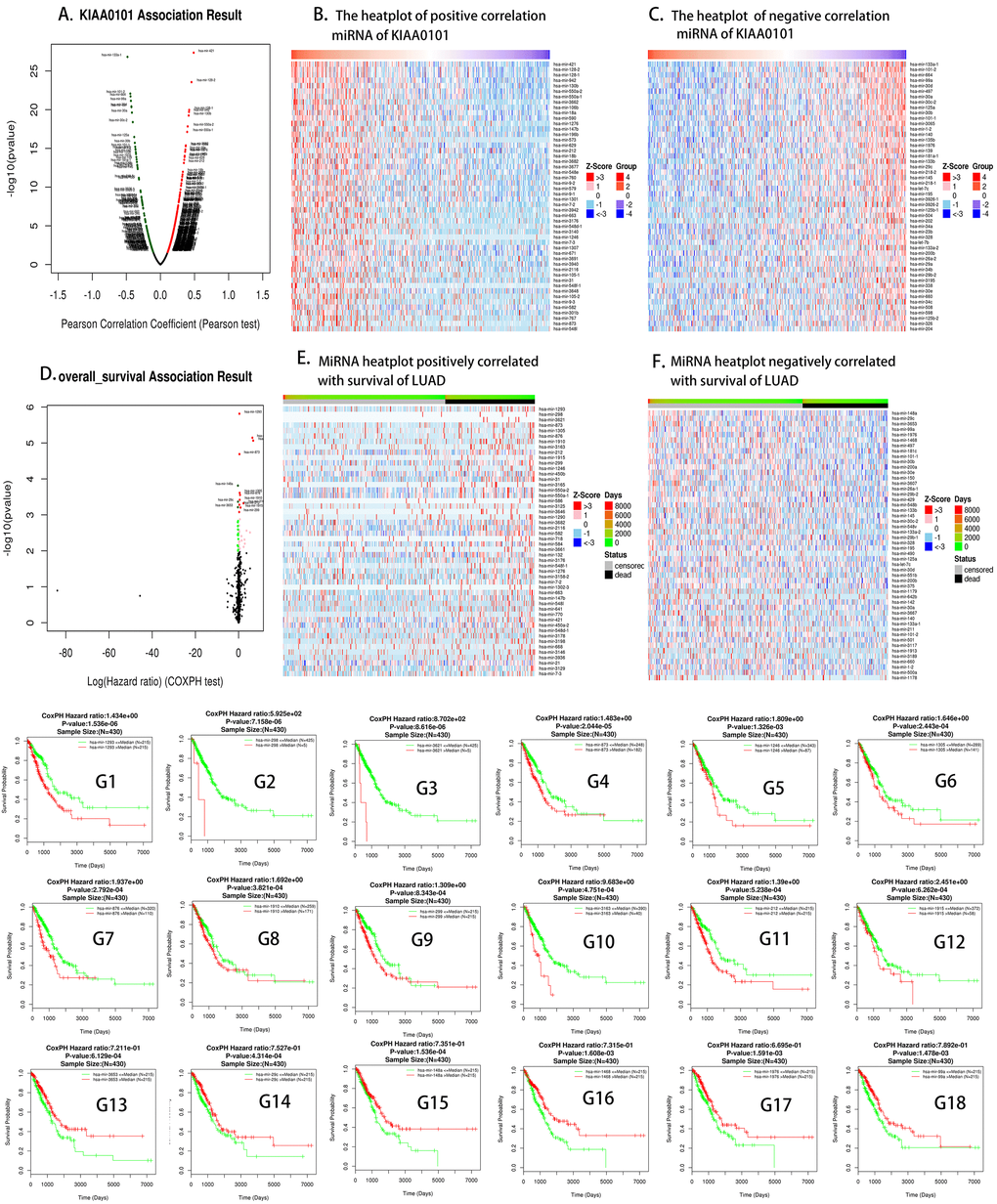 We conducted Gene Set Enrichment Analysis (GSEA) of KEGG pathway data [51], gene ontology cellular component, gene ontology biological process, gene ontology molecular function, a kinase target network, an miRNA target network, and a transcription factor target network of KIAA0101. We performed an miRNA Pearson correlation test and COXPH test of KIAA0101 using Linkedomics [17]. We found the differentially expressed genes related to KIAA0101 in LUAD. We analyzed lncRNAs associated with KIAA0101 using TANRIC [44] and assessed whether the level of lncRNA expression associated with KIAA0101 had different impacts on the survival of patients.