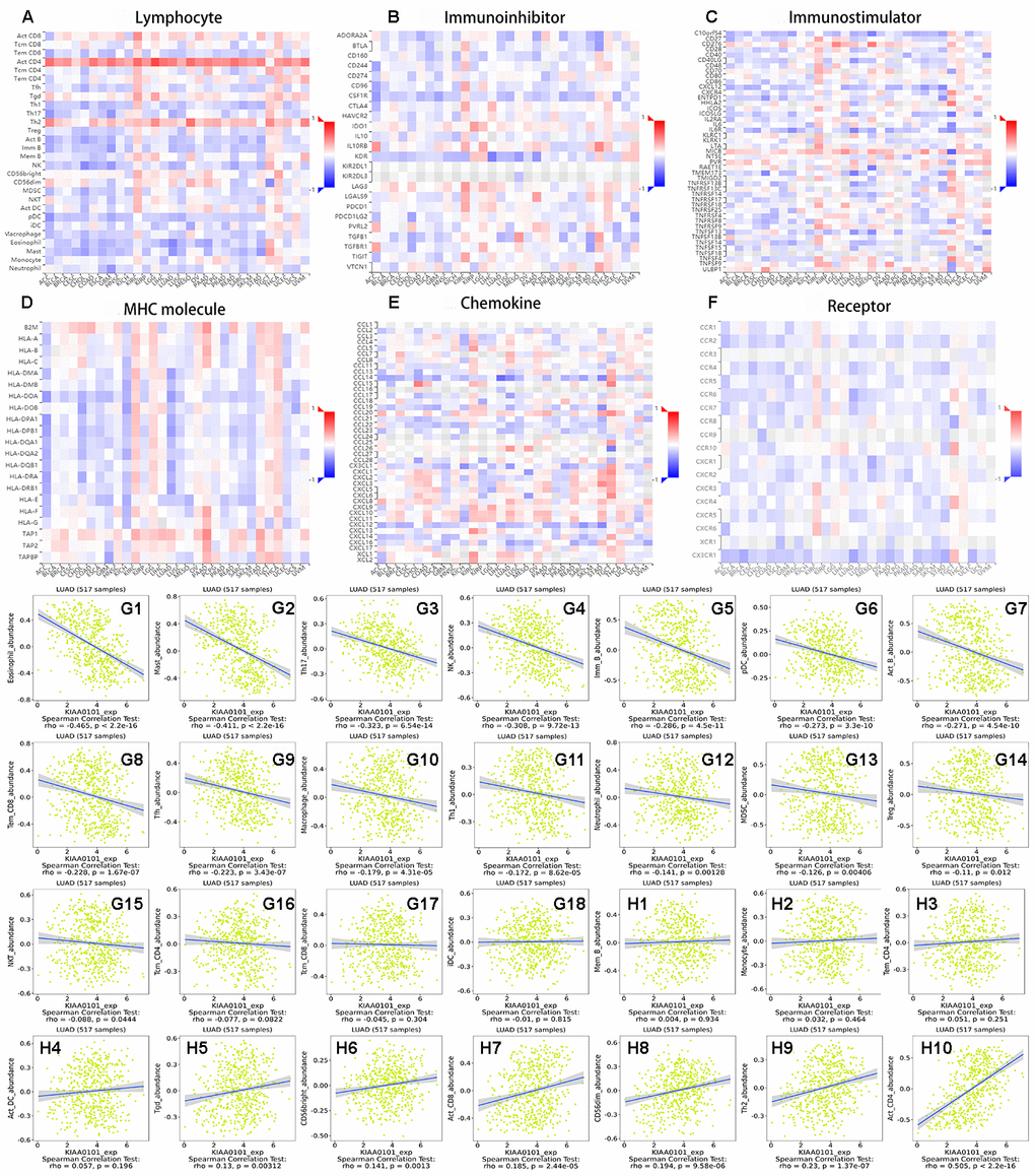 Figure 7A–7F show heat maps of the correlation between the expression of KIAA0101 in multiple cancers and different tumor infiltrating lymphocytes (TILs), immunoinhibitors, immunostimulators, MHC molecules, chemokines, and receptors. Figure 7G1–7G18 show scatter diagrams of tumor infiltrating lymphocytes that correlated negatively with KIAA0101 expression in LUAD. Figure 7H1–7H10 show scatter diagrams of TILs that correlated positively with KIAA0101 expression in LUAD. When the expression of KIAA0101 increased, the number of activated CD4 T cells increased. The numbers of Th1 cell, Th17 cells, and follicular helper cell were negatively related to the expression of KIAA0101, and Th2 cell numbers were positively related to the expression of KIAA0101 (P < 0.05). KIAA0101 expression correlated positively with the numbers of effector memory CD8 T cells, natural killer cells, regulatory T cells, activated B cells, immature B cells, plasmacytoid dendritic cells, macrophages, eosinophil, mast cells, and neutrophils (all P < 0.05). Supplementary Figures 9–13 show scatter plots of KIAA0101 expression related to immunoinhibitors, immunostimulators, MHC molecules, chemokines, and chemokine receptors, respectively. Most chemokine receptors correlated negatively with the expression of KIAA0101 (Supplementary Figure 13). The majority of MHC molecules correlated negatively with the expression of KIAA0101 (Supplementary Figure 11).