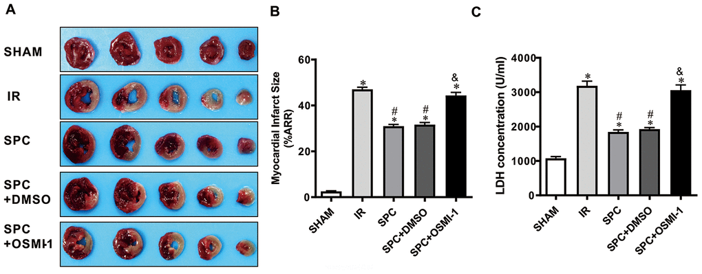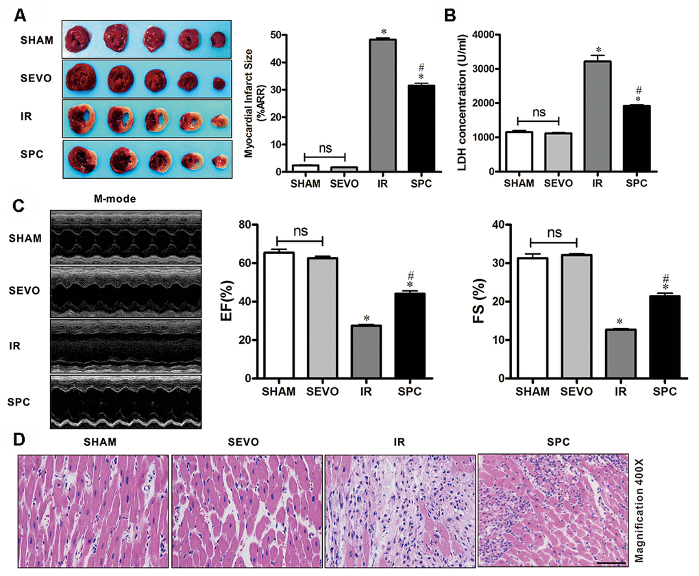 Myocardial damage was determined by measuring LDH release into the coronary effluent. MIRI increased the level of serum cardiac necroptosis marker enzyme LDH in the IR group, while SPC administration attenuated the increase in LDH levels in the SPC group (P<0.05, Figure 1B). No statistical differences were observed in LDH levels between the SHAM and SEVO group (P>0.05, Figure 1B).