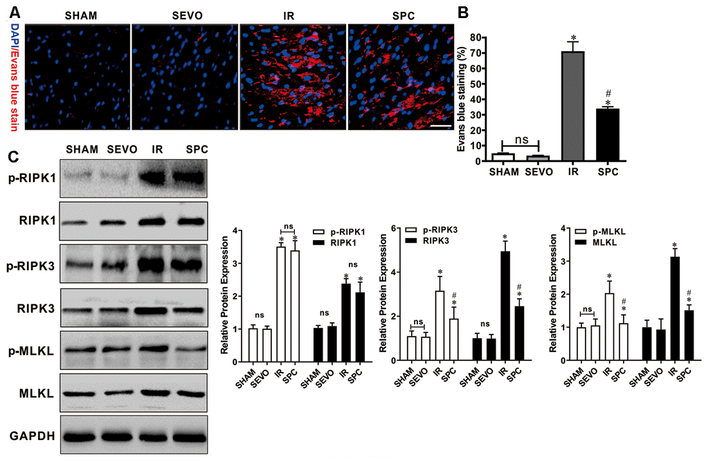 Evans blue dye uptake, an indicator for detecting necroptosis [16], was markedly increased after IR injury. Evans blue staining was used to determine the effect of SPC on necroptosis induced by MIRI. Compared to the IR group, SPC administration significantly reduced Evans blue dye uptake in the SPC group (P<0.05, Figure 2A, 2B). We then measured the protein expression levels of p-RIPK1, RIPK1, p-RIPK3, RIPK3, p-MLKL, and MLKL, which are important regulatory proteins for necroptosis. Western blotting demonstrated a significant increase in protein expression for the above regulatory proteins in the IR and SPC group compared to the SHAM group (P<0.05, Figure 2C). Compared to the IR group, SPC inhibited the up-regulation of p-RIPK3, RIPK3, p-MLKL, and MLKL protein expression (P<0.05, Figure 2C). The protein expression levels of p-RIPK3 and RIPK3 in SPC group were down-regulated significantly compared with the IR group, the reduction ratio of p-RIPK3 and RIPK3 was 40.10% and 50.34% respectively (P<0.05, Figure 2C). MLKL, as a downstream of RIPK3, promoted the occurrence of necroptosis. The Figure 2C, 2D also showed that the protein expression levels of p-MLKL and MLKL in SPC group was 40.10% and 40.10% decreased respectively compared with the IR group. However, the expression levels of p-RIPK1 and RIPK1 in the IR group and SPC group had no statistical differences (P>0.05, Figure 2C). Collectively, our results indicate that SPC administration suppressed the up-regulation of RIPK3/MLKL mediated necroptosis induced by MIRI.