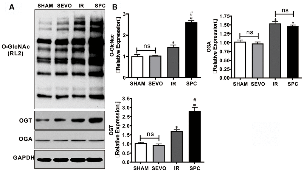 OGT has been demonstrated to act as a negative regulator of necroptosis by inhibiting RIPK3 expression, while O-GlcNAcylation dysfunction sensitizes cells to various kinds of stress, which ultimately results in cell necroptosis [13, 14, 17]. Hence, we measured the expression levels of O-GlcNAc, OGT and OGA to determine the underlying mechanism of SPC. OGT and OGA act as a pair of enzymes that actively control O-GlcNAc modification cycling. Western blot analysis demonstrated that O-GlcNAc, OGT and OGA protein expression levels in the IR and SPC groups were increased compared to the SHAM and SEVO groups (P<0.05, Figure 3). SPC administration further up-regulated the expression levels of O-GlcNAc and OGT in the SPC group (P<0.05, Figure 3). However, no significant differences in OGA protein expression levels were observed between the IR and SPC groups (P>0.05, Figure 3). This indicated that SPC enhances OGT mediated O-GlcNAcylation.