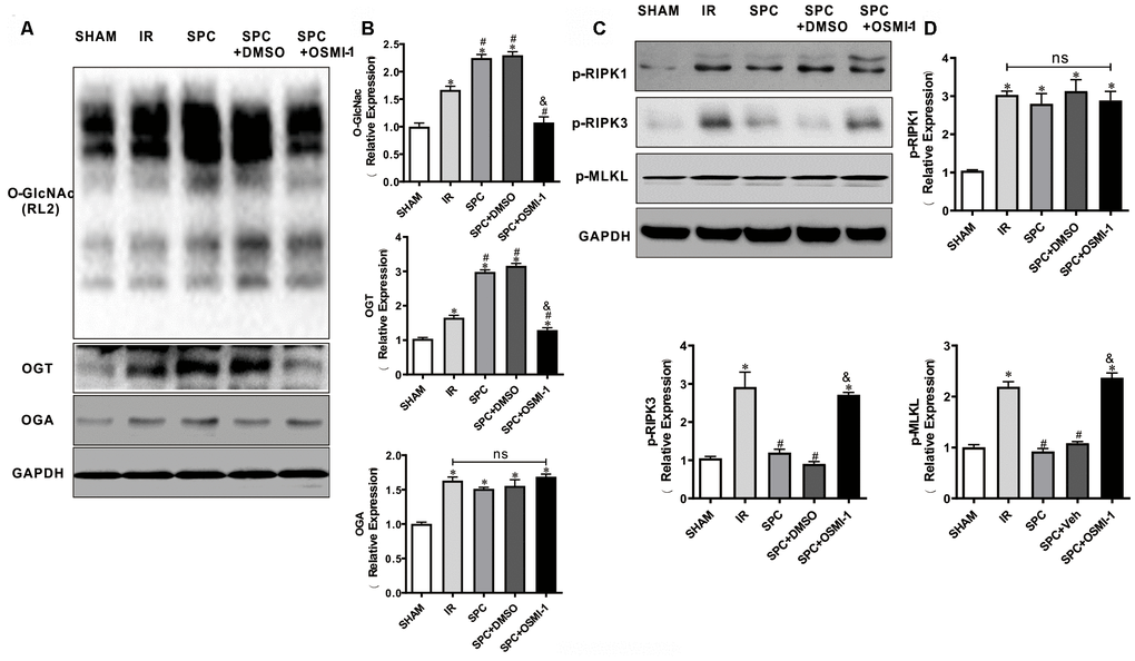 Western blot analysis demonstrated that SPC down-regulated p-RIPK3 and p-MLKL expression levels in our in vitro model (P<0.05 vs SHAM group, Figure 6C, 6D), while OSMI-1 reversed the down-regulation of p-RIPK3 and p-MLKL induced by SPC (P<0.05, Figure 6C, 6D). Our results demonstrated that OSMI-1 inhibits OGT mediated O-GlcNAcylation and up-regulates necroptosis signaling to reverse the protective effects of SPC.