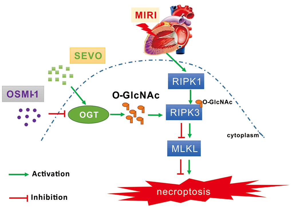 Previous studies have found that ischemic preconditioning and postconditioning reduced cell necroptosis induced by ischemia reperfusion injury [5]. Necroptosis, a form of cell death resembling a necrotic phenotype, has been identified in cardiac pathologies. Its inhibition has been demonstrated to be cardioprotective. Previous studies have demonstrated that ischemic preconditioning protects against ischemia reperfusion injury by inhibiting receptor-interacting protein kinase 1 (RIPK1)/receptor-interacting protein kinase 3 (RIPK3)/mixed lineage kinase domain-like (MLKL) axis mediated necroptosis [6]. Necroptosis is mediated by the necrosome, a signaling protein complex that is composed of RIPK3 and MLKL [7]. Recent studies have shown that O-GlcNAc transferase (OGT) suppresses necroptosis by targeting RIPK3 [8].