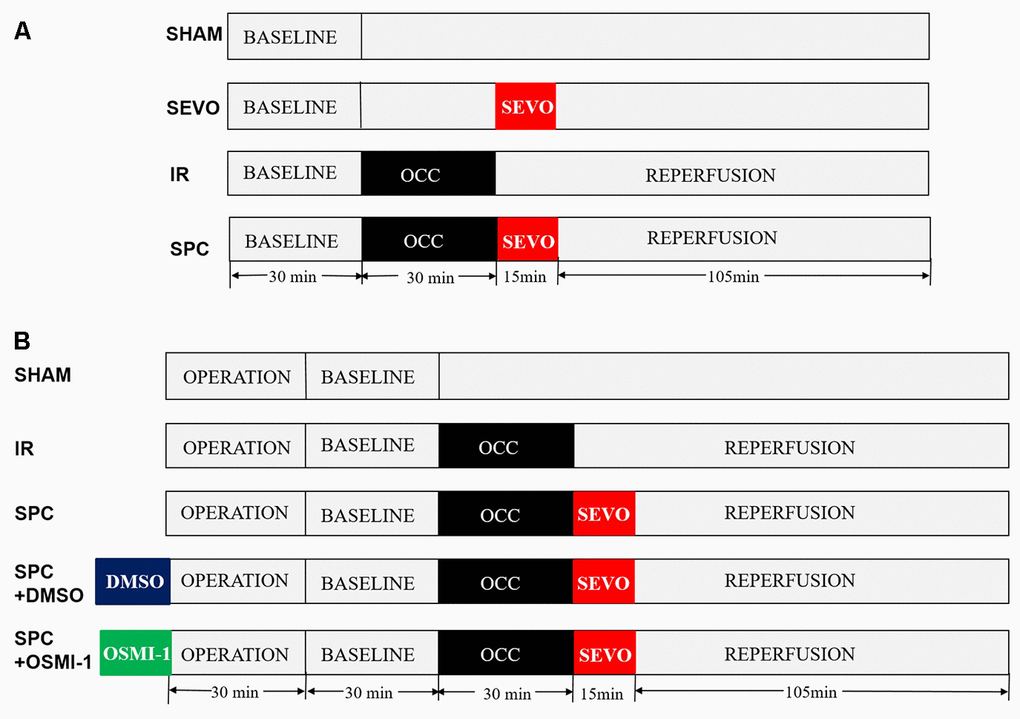 Rats were randomly divided into four groups: SHAM group, SEVO group, IR group and SPC group. Except the SHAM and SEVO groups, each rat was subjected to 30 min of LAD occlusion, followed by 2 h of reperfusion. In the SEVO group, the rats received 1.0 minimum alveolar concentration (MAC) sevoflurane (2.4% sevoflurane, 37° C) for 15 min without occlusion. Sevoflurane (Maruishi Pharmaceutical Co, Chuoku, Osaka, Japan) was added to the inspired gas starting 1 min before reperfusion to achieve the concentration at 1.0 MAC. In the SPC group, after 30 min of LAD occlusion, the rats inhaled 1.0 MAC sevoflurane for 15 min starting from the end of ischemia until 15 min after reperfusion, then reperfusion the hearts for 105 min. The experimental design is shown in Figure 8A.