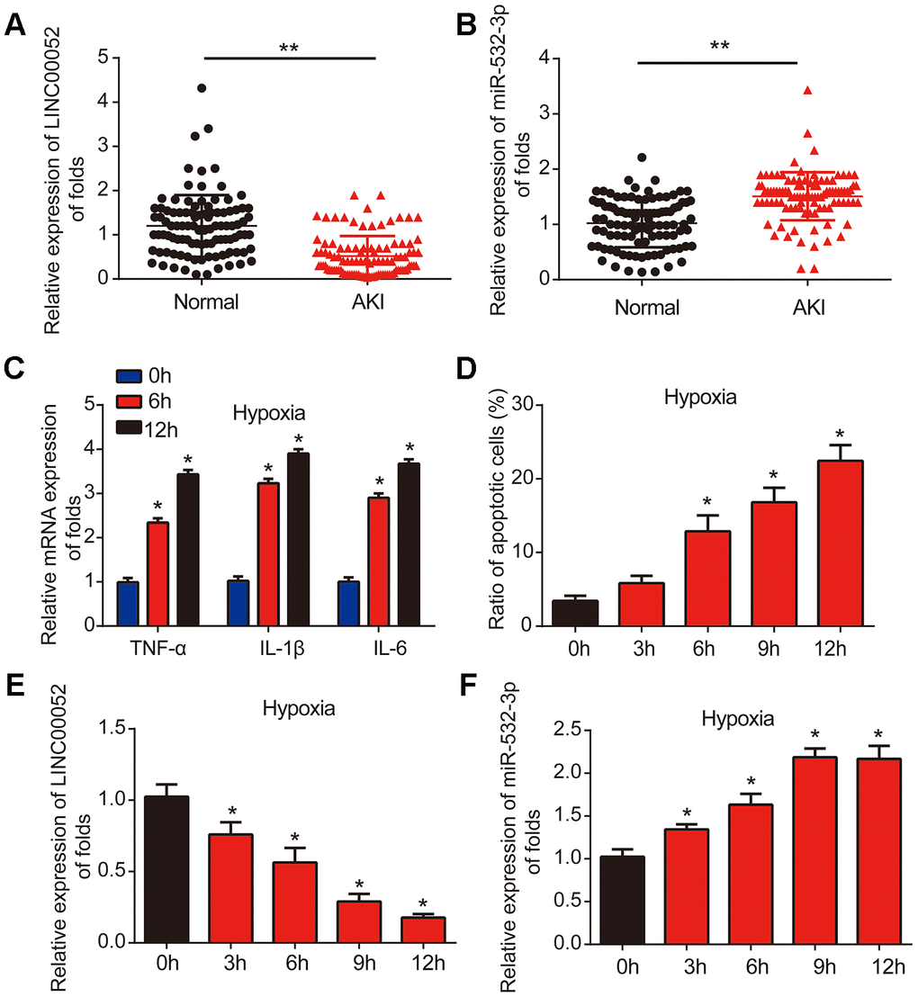 Firstly, we measured the levels of LINC00052 and miR-532-3p expression in serum from AKI patients (n = 100) and healthy controls (n = 100) using qRT-PCR. The level of LINC00052 was decreased in AKI patient serum (Figure 1A), while the level of miR-532-3p was increased in AKI patient serum (Figure 1B). Next, we developed a hypoxia-induced NRK-52E cell model. We found that the expression of TNF-α, IL-1β and IL-6 mRNA was induced by hypoxia after 6 and 12 h (Figure 1C). Flow cytometry assays demonstrated that apoptosis was triggered in NRK-52E cells in a time-dependent manner starting after 6 h of hypoxia (Figure 1D). We then uncovered that LINC00052 expression was decreased in hypoxic NRK-52E cells (Figure 1E), while miR-532-3p expression was strongly upregulated in hypoxic NRK-52E cells (Figure 1F). These results suggest that LINC00052 and miR-532-3p might be involved in AKI.