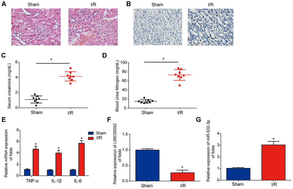 Next, we established I/R-triggered AKI rat models to explore the roles of LINC00052 and miR-532-3p in AKI. We confirmed induction of acute kidney injury through HE staining and TUNEL assays (Figure 2A and 2B). We observed that SCr and BUN were strongly upregulated in the serum of AKI rat models 24 h after I/R surgery (Figure 2C and 2D). In addition, we found that TNF-α, IL-1β and IL-6 were induced in renal tissue from AKI rats (Figure 2E). Furthermore, LINC00052 expression was decreased while miR-532-3p expression was increased in the kidneys of AKI rats (Figure 2F and 2G). These results suggest that LINC00052 and miR-532-3p are involved in AKI.